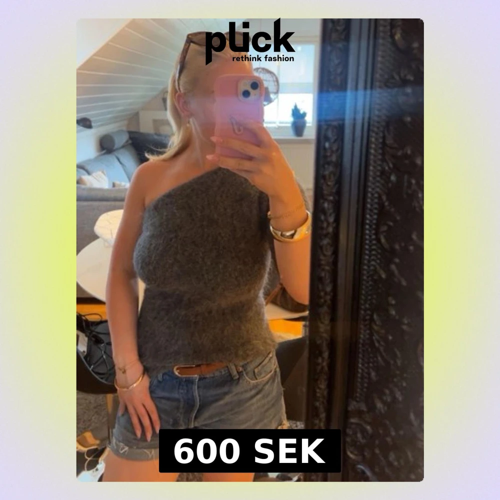 Snygg mörkgrå stickad topp med oneshoulder-design. Mjuk och lite lurvig känsla, perfekt för dig som vill ha något unikt och trendigt