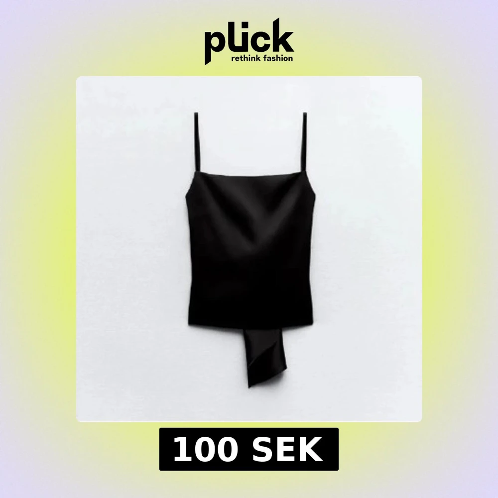 Elegant svart axelbandslös topp i silkes liknande material med öppen rygg och knytning. Använd några gånger, köpt i somras. Några trådar här och där men ingen större defekt. Storlek xs