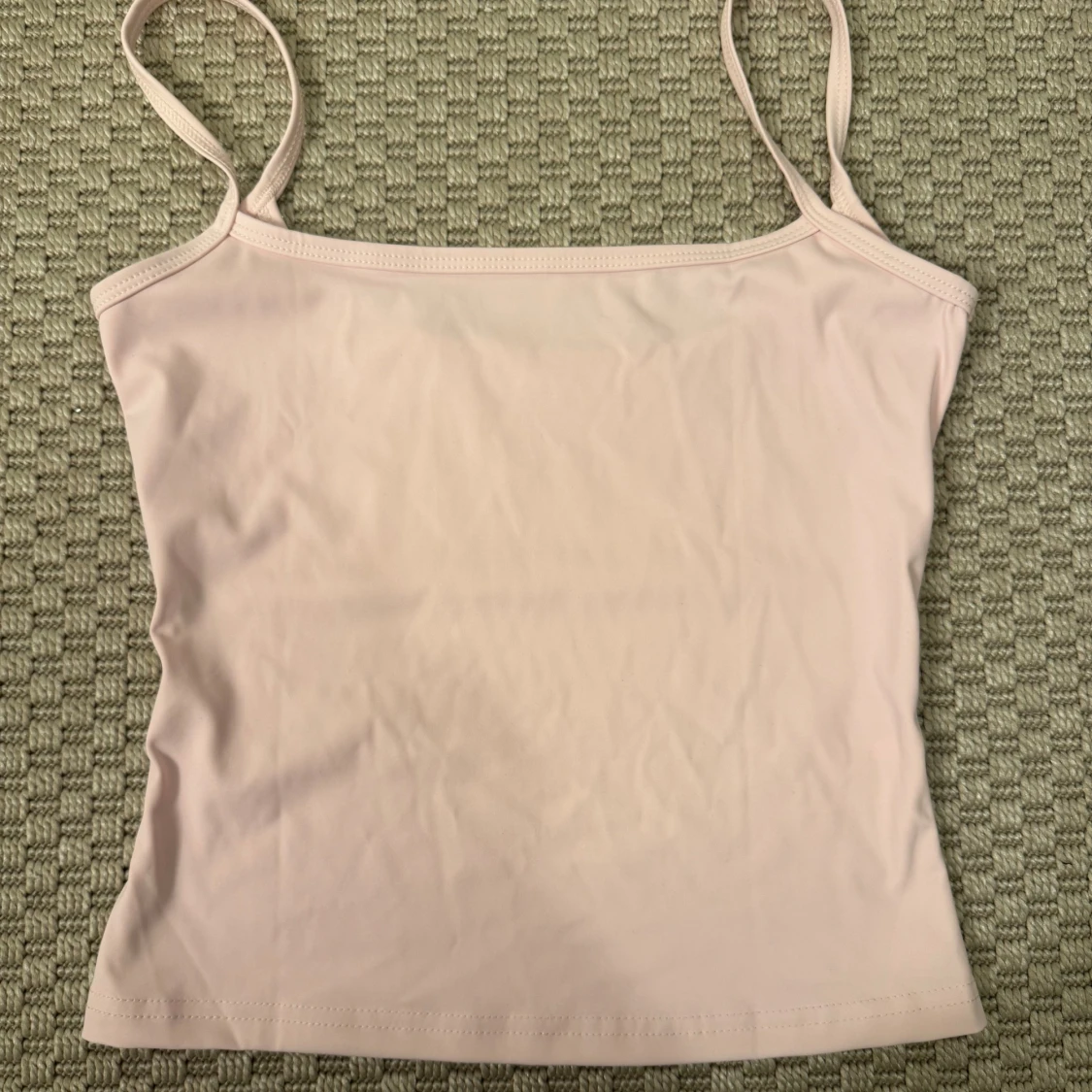 Aldrig använt. Säljer en enkel och stilren ljusrosa linnetopp med smala axelband. Toppen har en rak och tight passform, perfekt för att matcha med jeans eller kjol. Materialet känns mjukt och lätt mot huden, vilket gör den skön att bära under varma dagar.