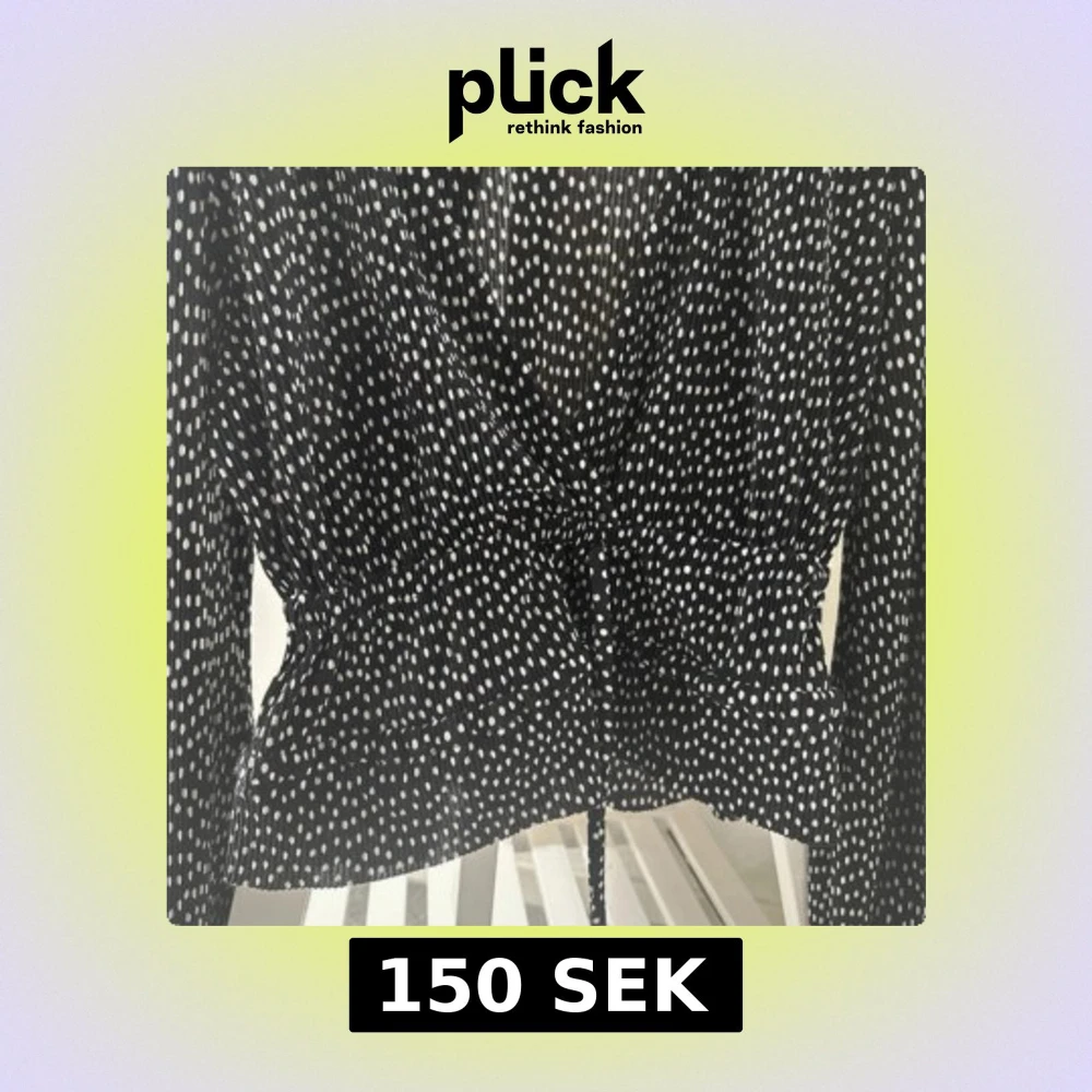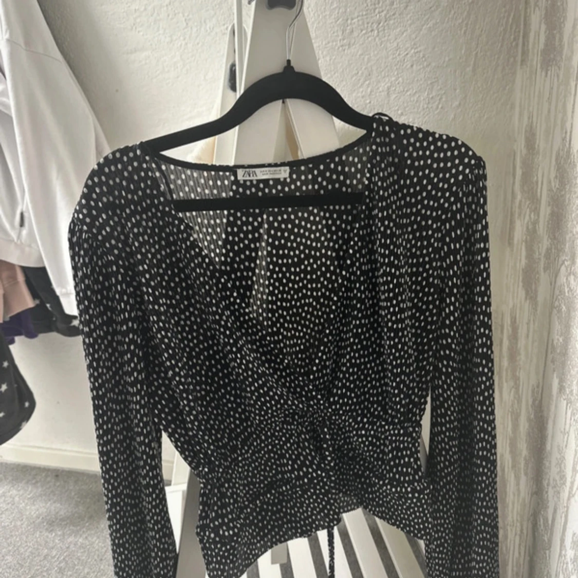 Svart omlottblus från Zara med vita prickar, v-ringning och långa ärmar. Blusen har knyt i midjan och lätt volang nedtill. Tunt och luftigt material som ger en snygg siluett. Perfekt för dig som gillar trendiga mönster och en feminin look.