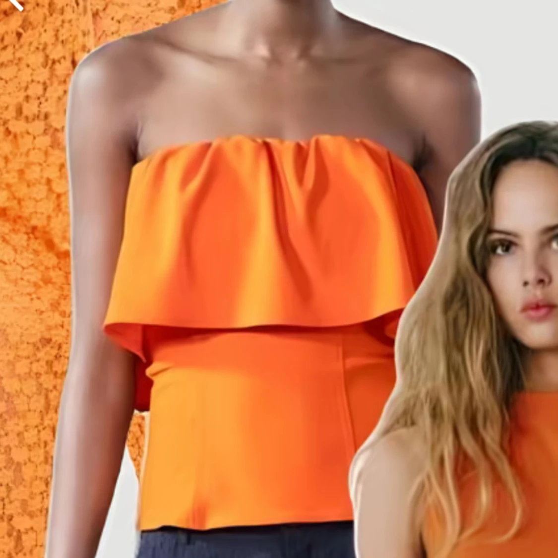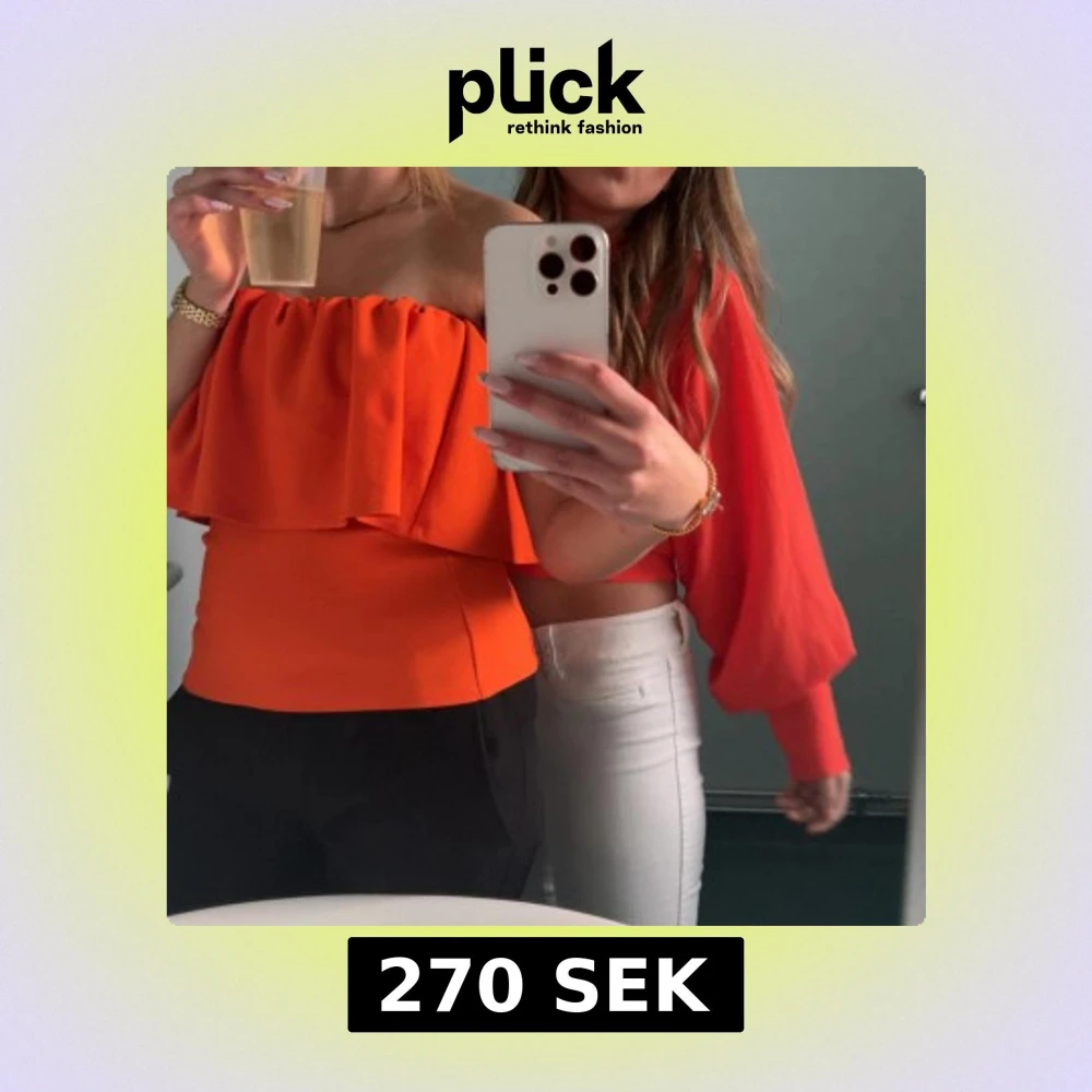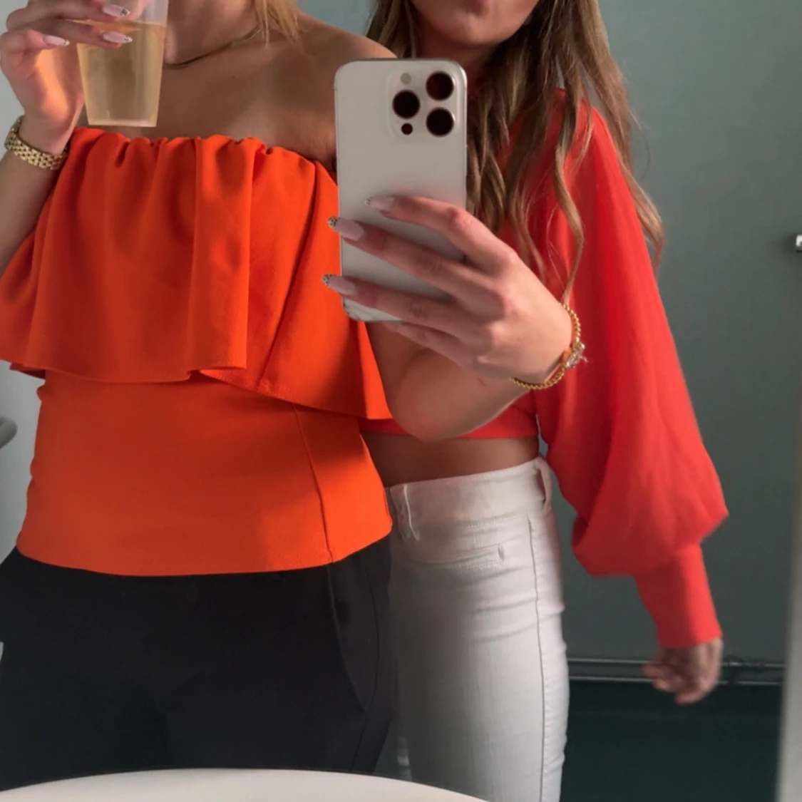 Superfin orange axelbandslös topp med volangdetalj upptill. Använd en gång.
