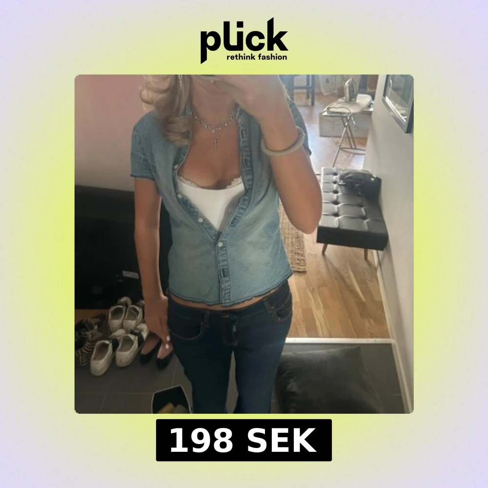 Säljer en ljusblå croppad jeansskjorta med korta ärmar och knappar framtill. Skjortan har en avslappnad passform och är tillverkad i klassiskt jeanstyg. Perfekt för en cool och avslappnad stil.