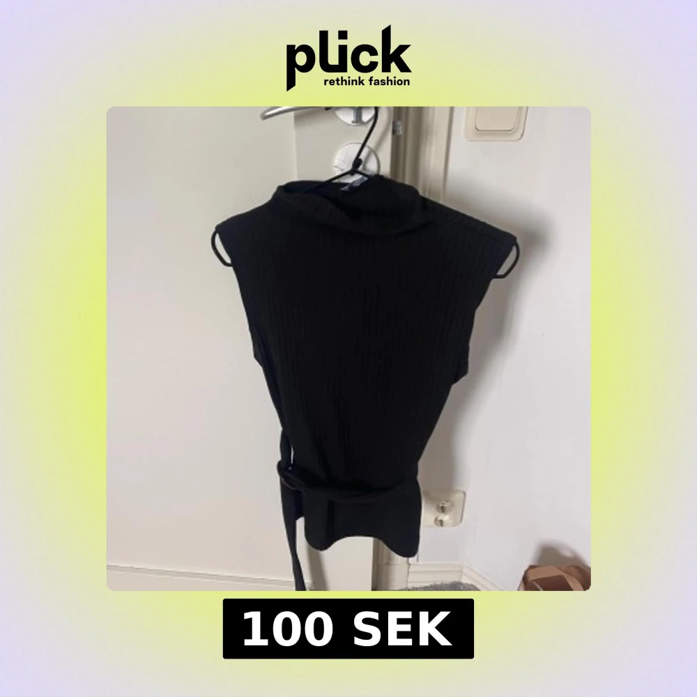 Säljer en svart ribbad polotopp utan ärmar. Toppen har en hög krage och ett matchande bälte i midjan som ger en snygg siluett. Perfekt att styla med jeans eller kjol för en clean look.