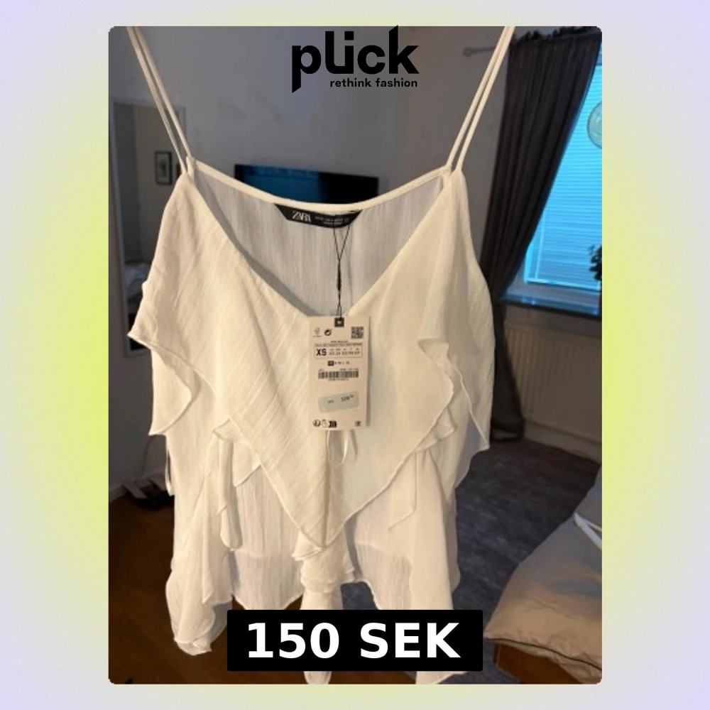 Säljer en superfin vit topp från Zara med tunna axelband och flera lager volanger. Toppen har en luftig och flowy känsla, perfekt för varma dagar. Materialet är lätt och känns skönt mot huden. Snygg att styla till både jeans och kjol!