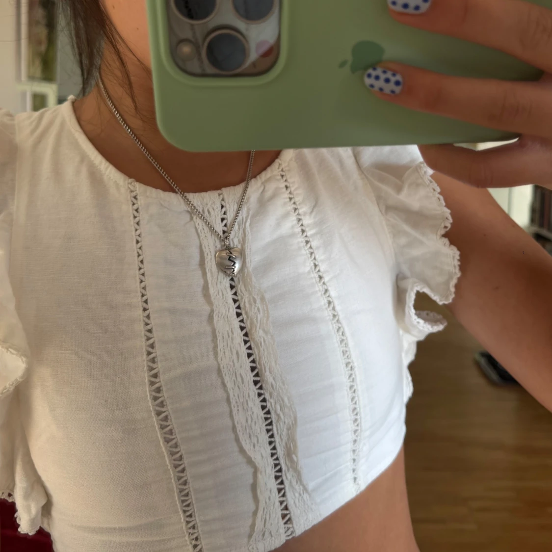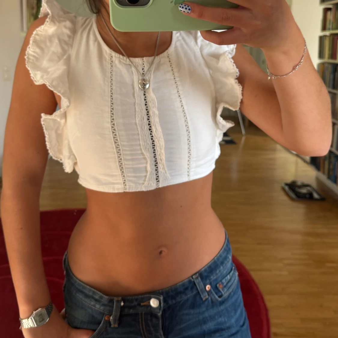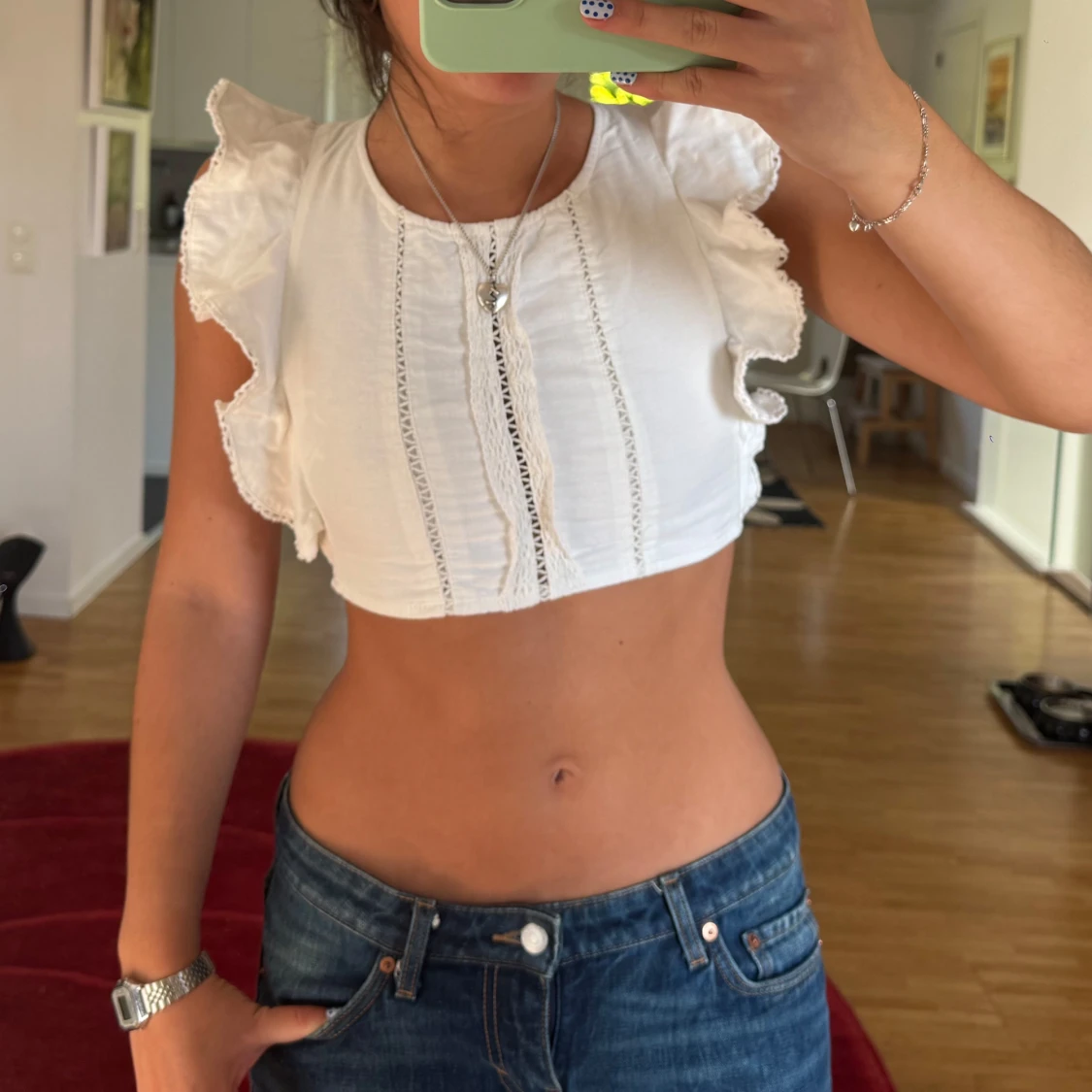 Superfin vit croppad blus med volangärmar och snygga spetsdetaljer framtill. Toppen har öppen rygg med snörning
