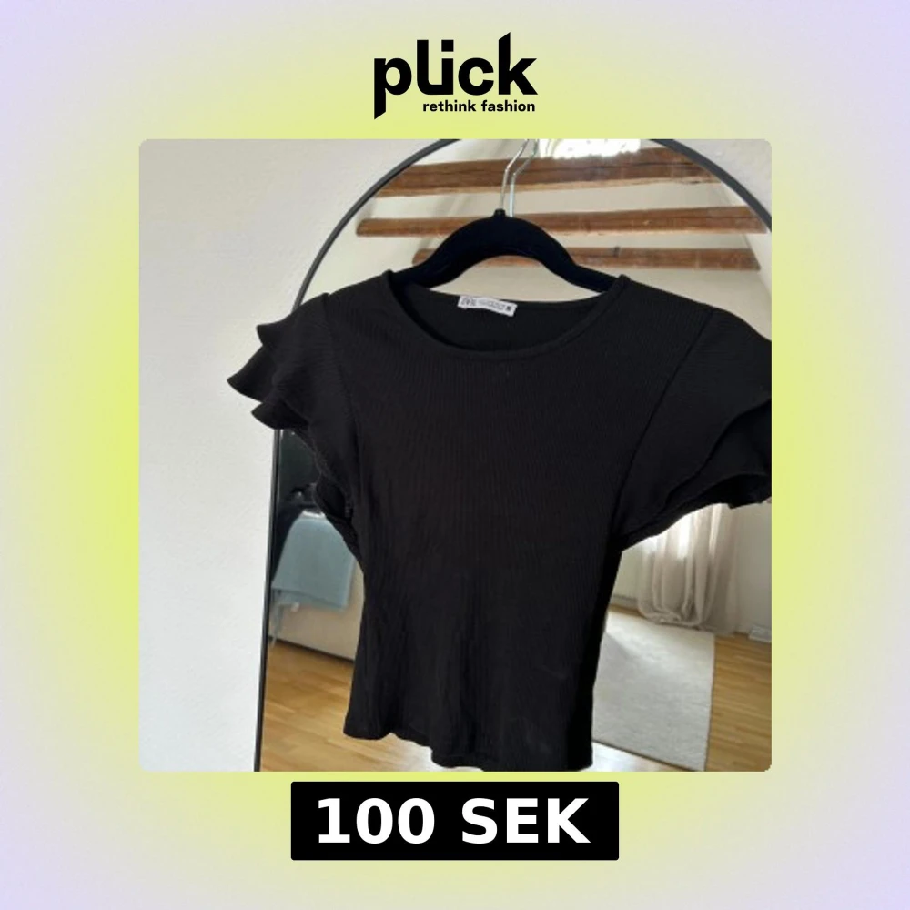 Svart ribbad topp från Zara med korta volangärmar och rund halsringning. Snygg croppad passform som ger en trendig vibe. Perfekt att matcha med jeans eller kjol för en cool look.