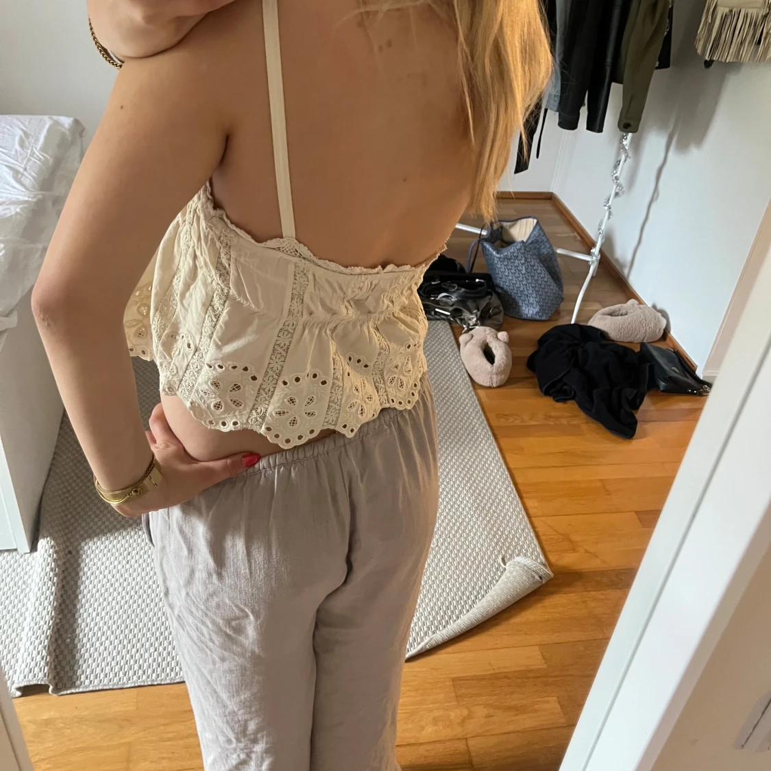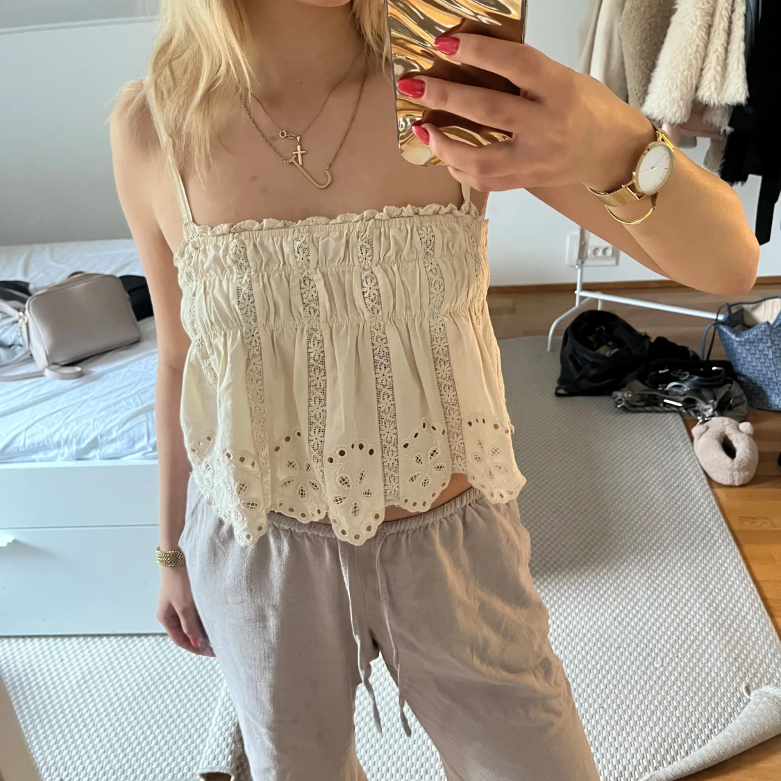 Säljer en söt vit linnetopp med tunna axelband och vackra spets- och broderidetaljer. Den är använd ett par gånger och i skick som ny!