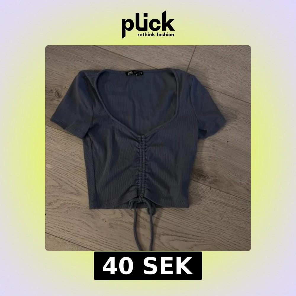 Snygg blå croppad topp från ZARA med korta ärmar och djup v-ringning. Toppen har ribbad struktur och snörningsdetalj. Storlek XXS