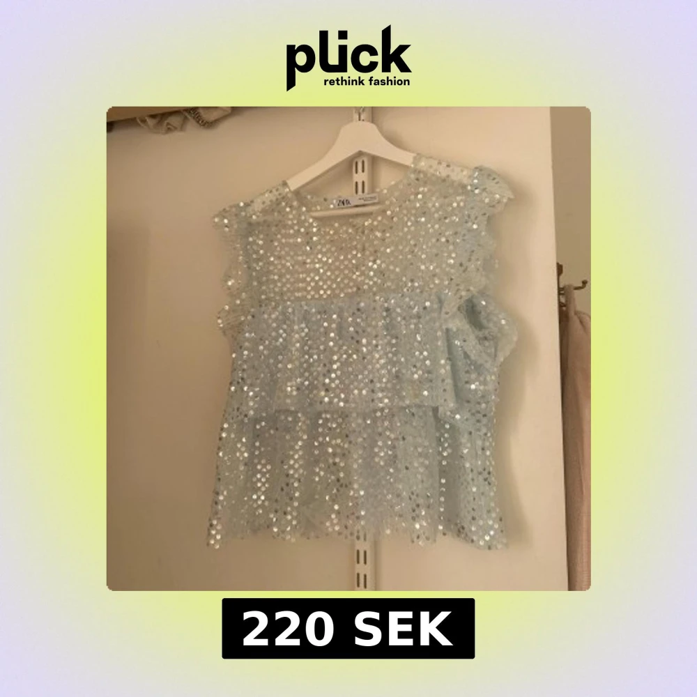 Säljer en glittrig ljusblå topp från Zara med paljetter över hela ytan. Toppen har volangdetaljer och är ärmlös, perfekt för en festlig look. Den är luftig och ger en elegant touch till din outfit. 🤩
