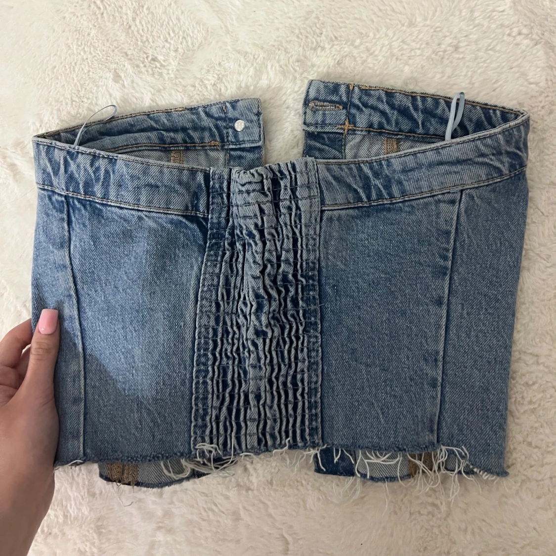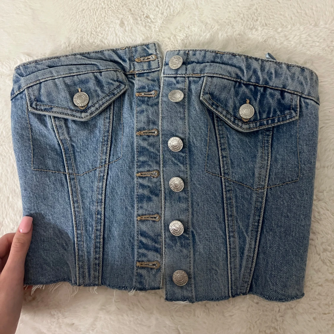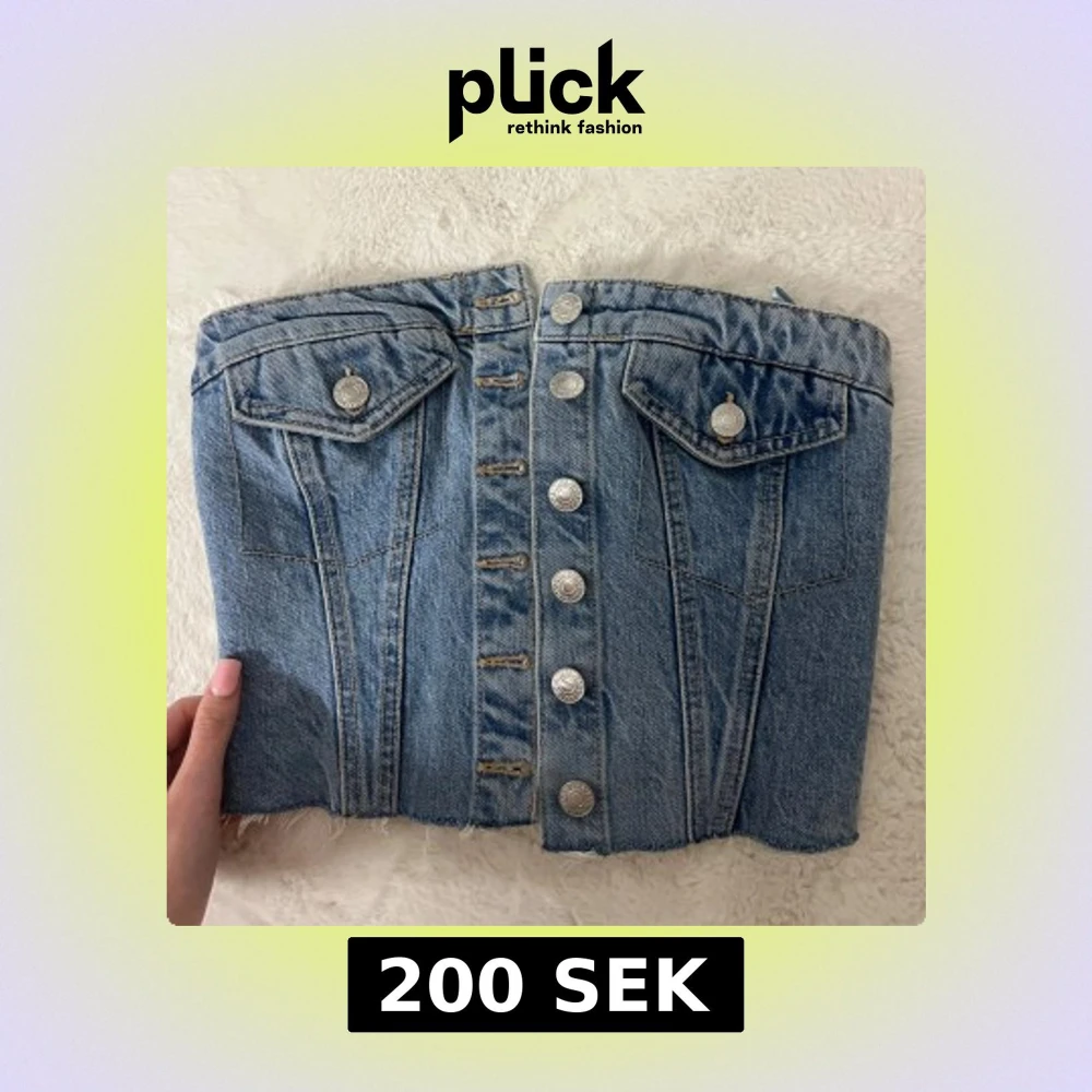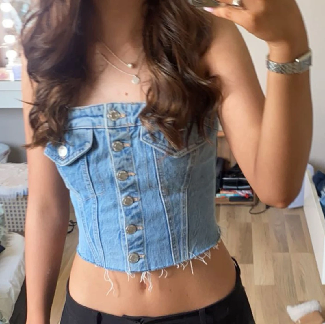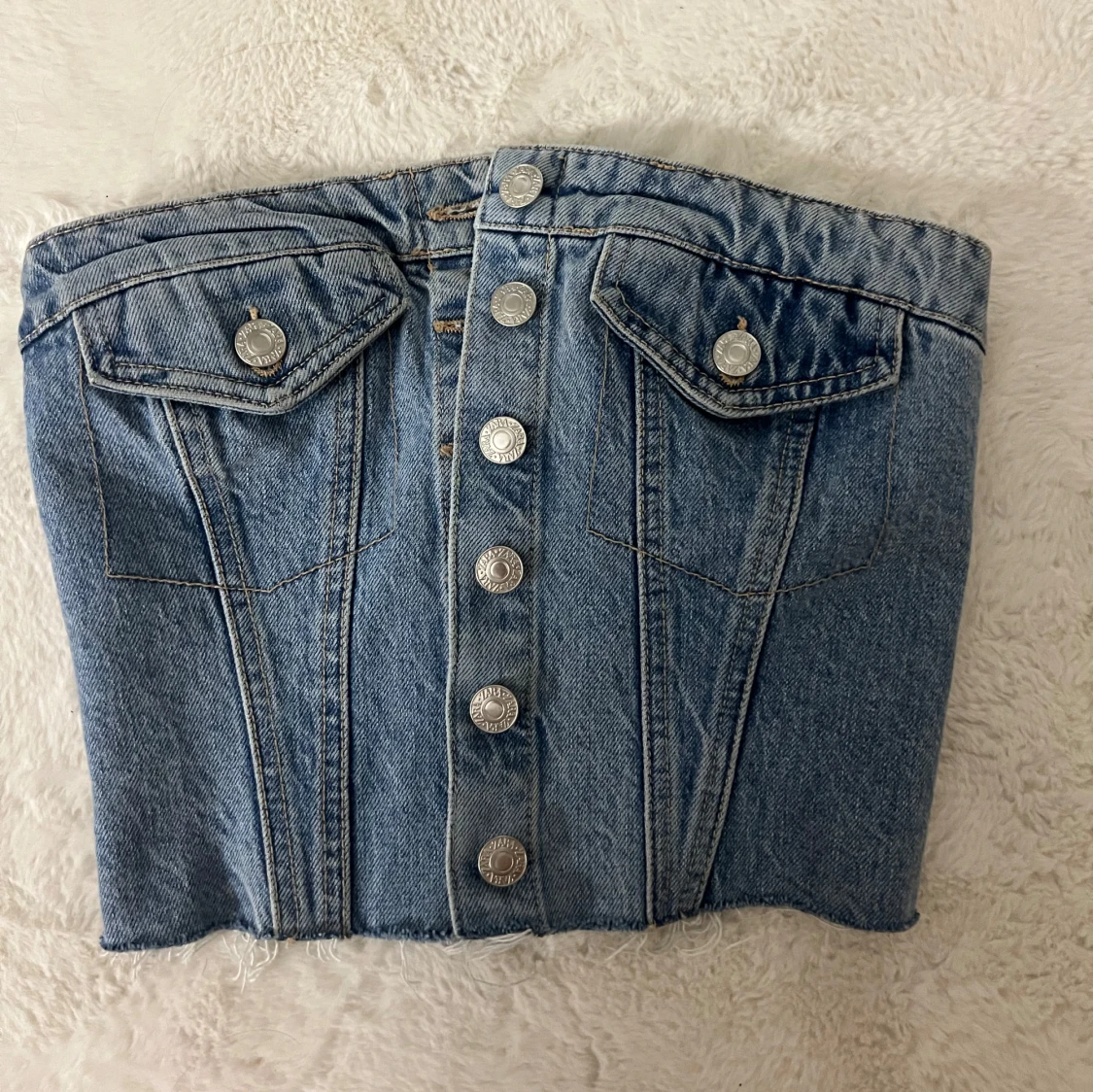 Säljer en snygg jeans korsettopp med silverfärgade knappar framtill och två bröstfickor med lock. Toppen är croppad med rå kant nertill och har en tight passform. Perfekt för att skapa en cool och trendig look.