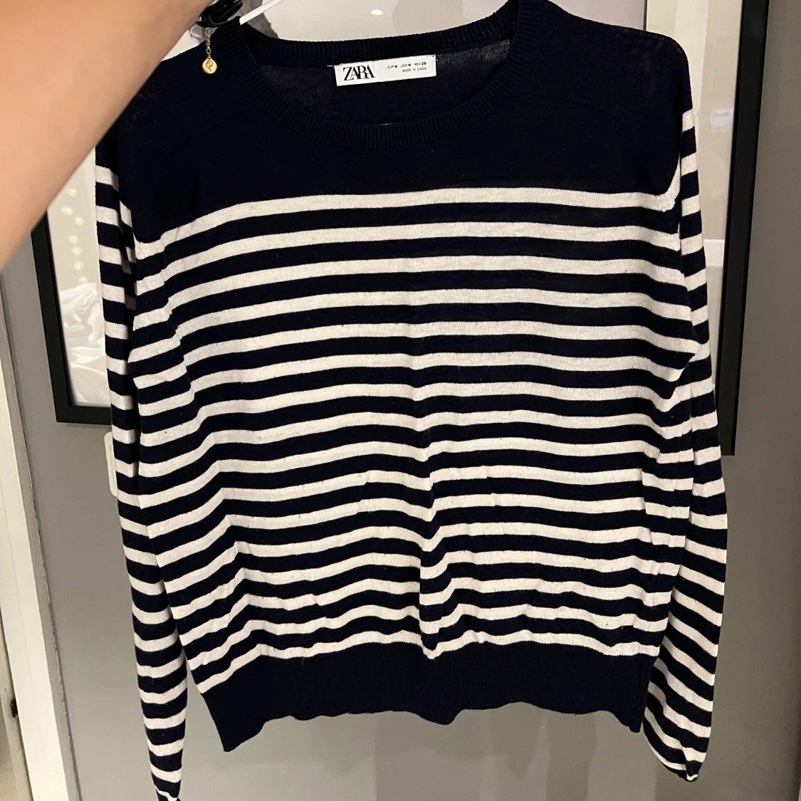 Marinblå randig stickad tröja från Zara i storlek M. Sparsamt använd! Kan både posta och mötas upp och kan även skicka fler bilder om det önskas!💕