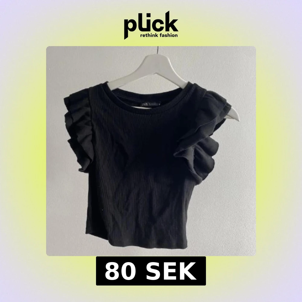 Säljer en snygg svart ribbad topp från Zara med volangdetaljer på axlarna. Toppen är ärmlös och har en croppad passform. Perfekt för att ge din outfit en trendig touch!