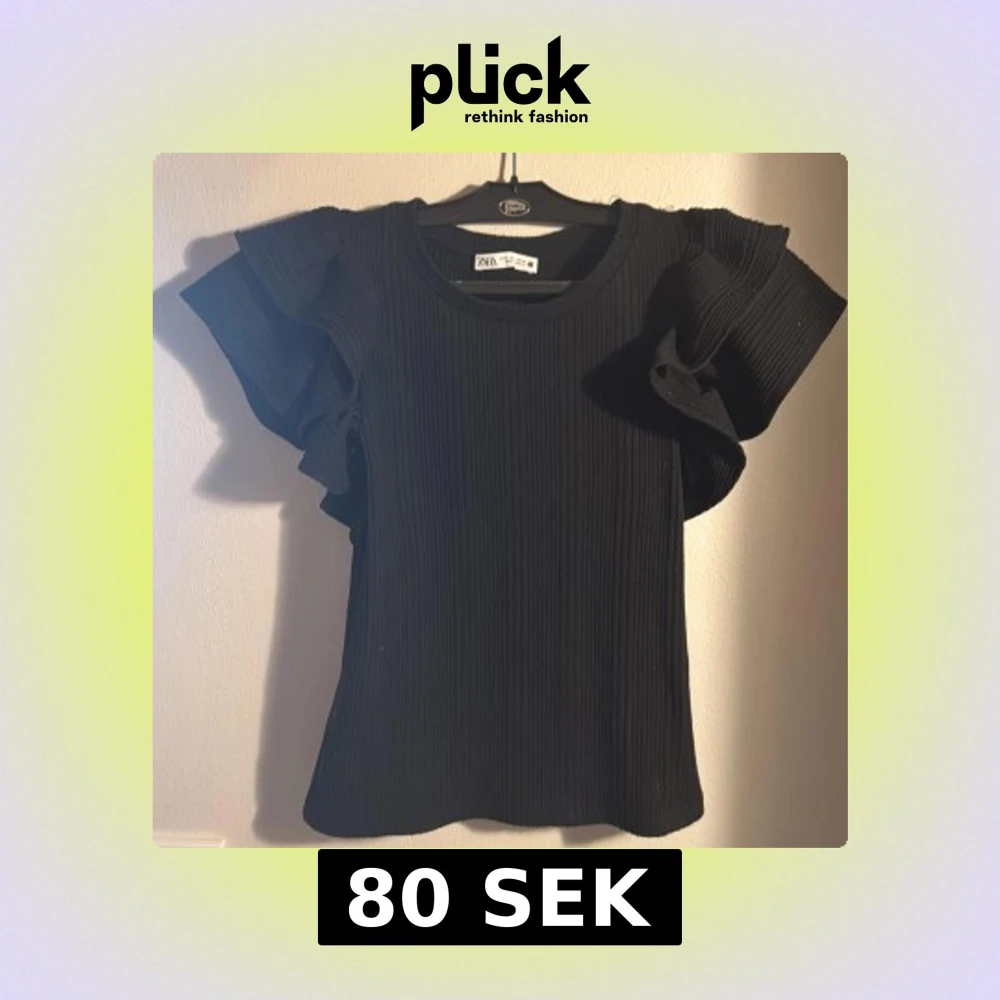Snygg och söt svart ribbad topp från Zara med volangdetaljer på ärmarna. Endast använd 1 eller 2 gånger tror jag. Strl S men Xs funkar säkert också!
