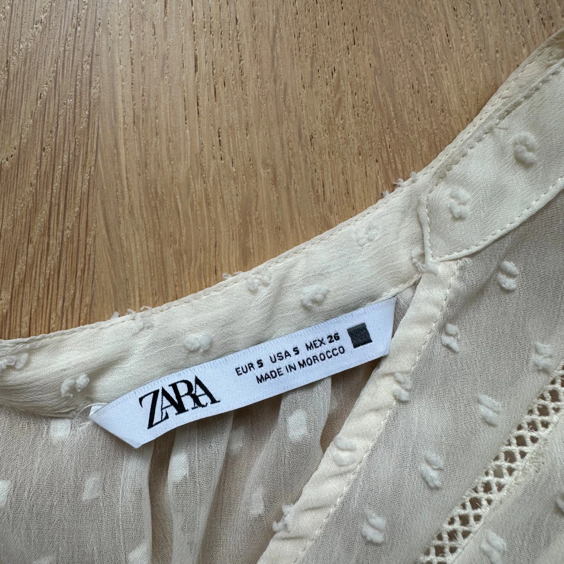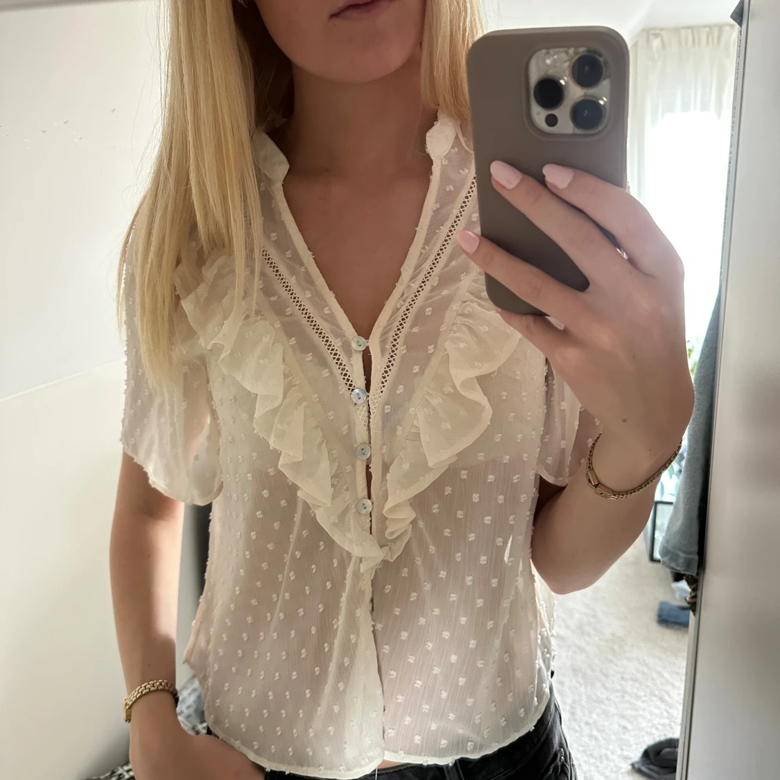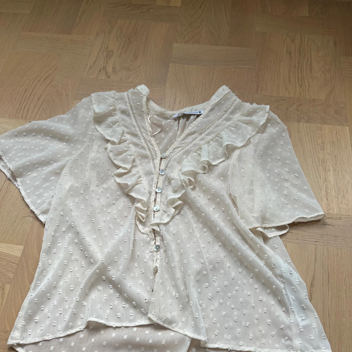 Supersöt vit blus från Zara med korta ärmar, volangdetaljer längs knäppningen och små prickar i tyget. Blusen är lätt transparent och har knappar framtill. Perfekt för dig som gillar romantisk och feminin stil.