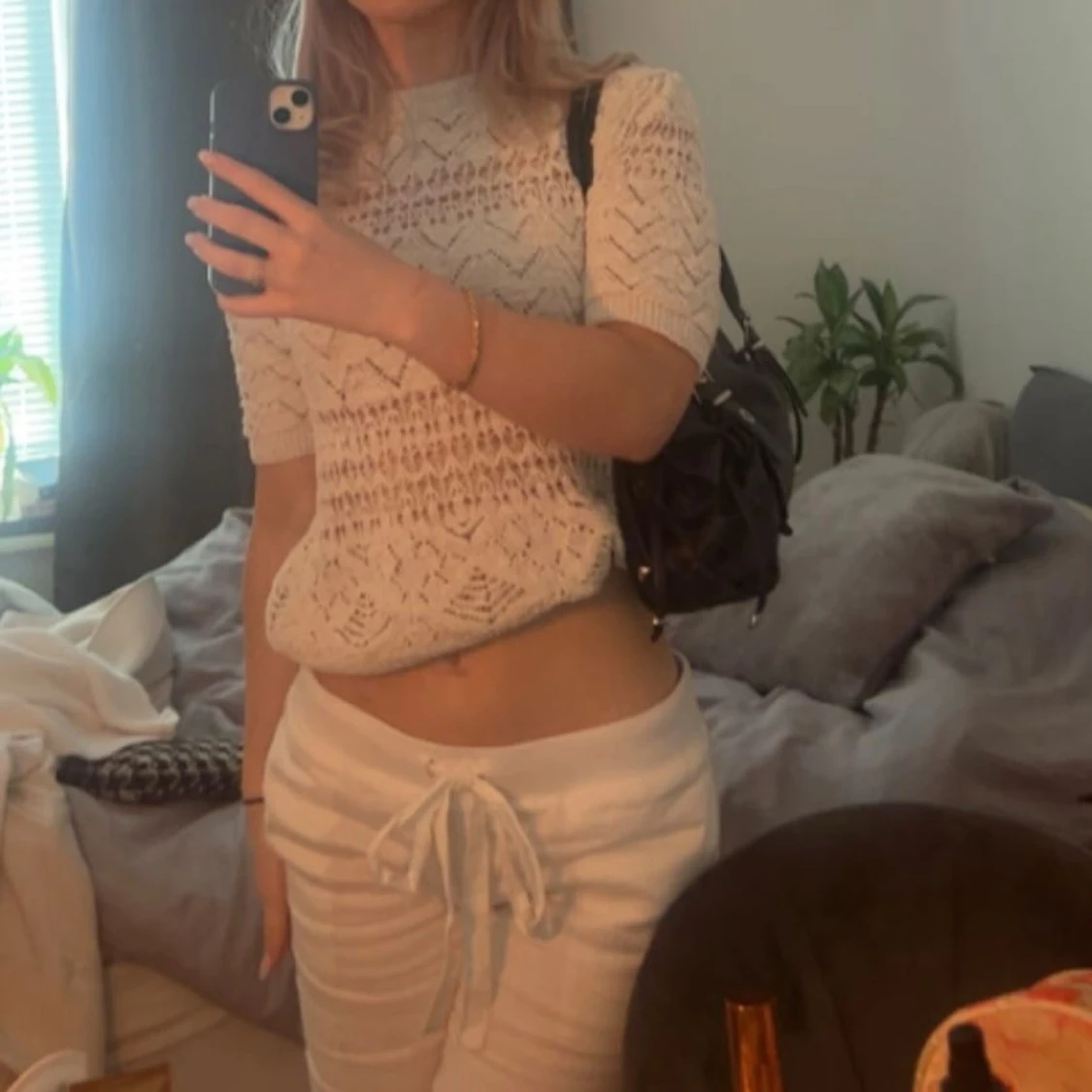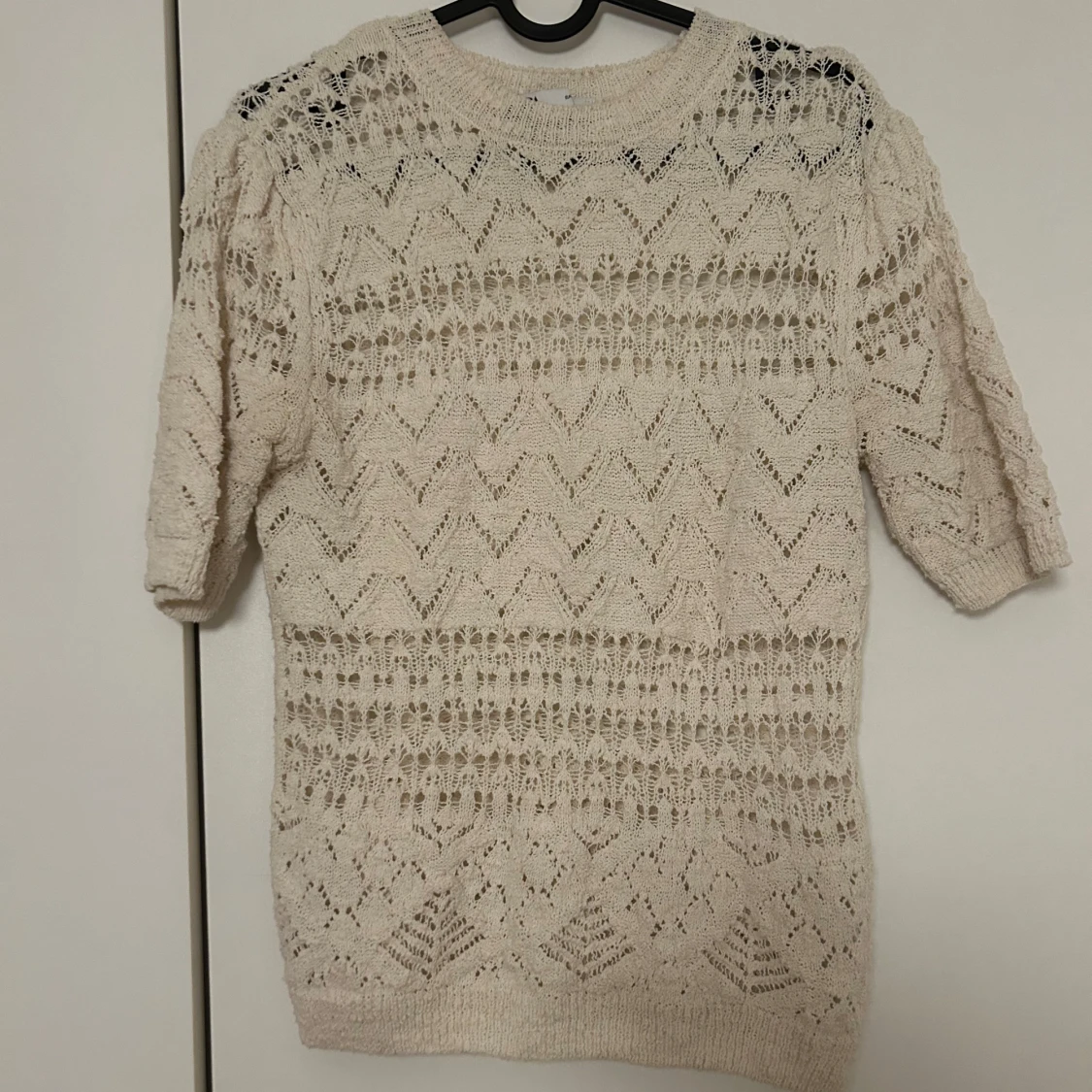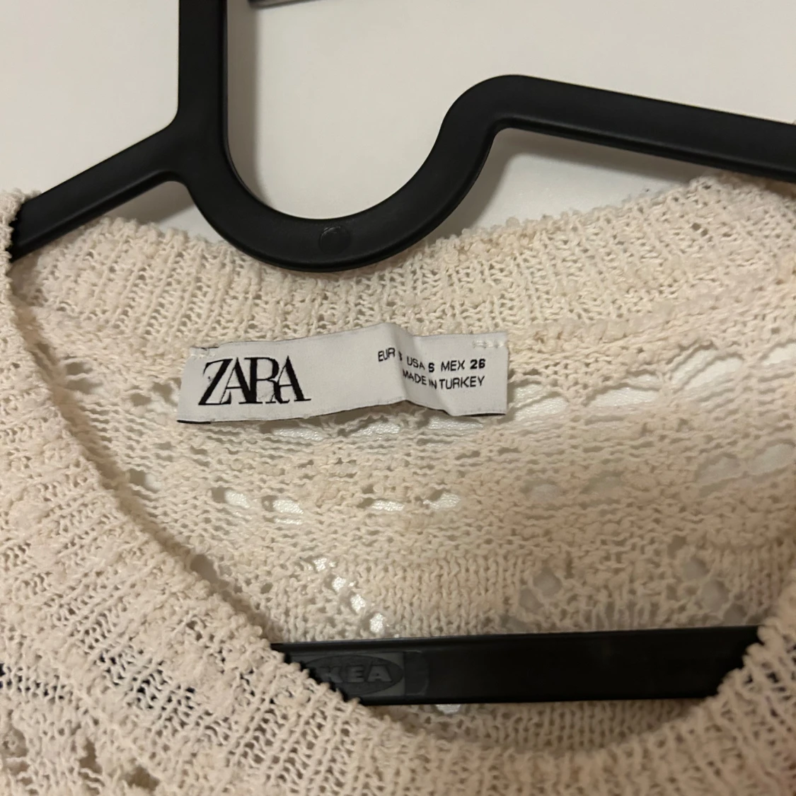 Superfin stickad topp från Zara i ljusbeige med korta ärmar och snyggt spetsmönster