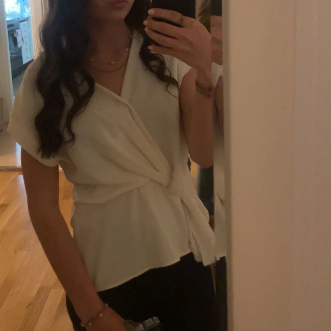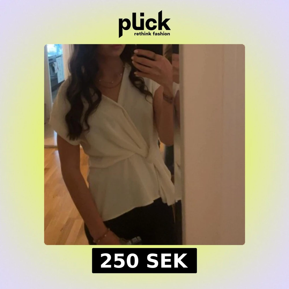 Säljer min stilrena vita blus från Zara med omlott-design och knyt i midjan. Använd ett fåtal gånger💗