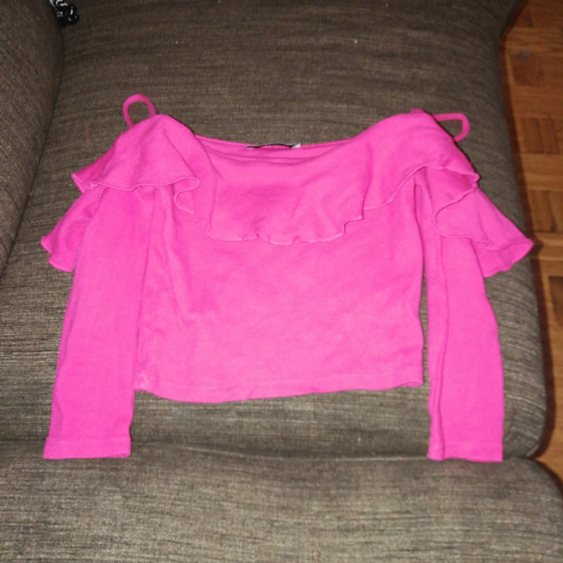 Rosa off shoulder topp med axelband, volanger runt om toppen och så halv korta armar. Jättesöt till sommaren, använt den 1 gång, nu är den för liten på mig