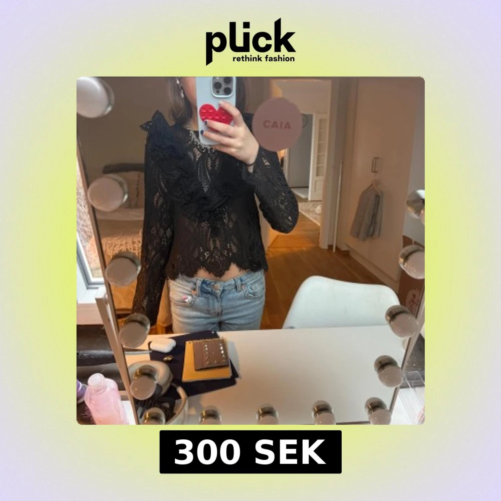 Säljer en elegant svart spetsblus med vackra volangdetaljer. Blusen har långa ärmar och en fin struktur som ger en lyxig känsla. Perfekt för att lyfta vilken outfit som helst.