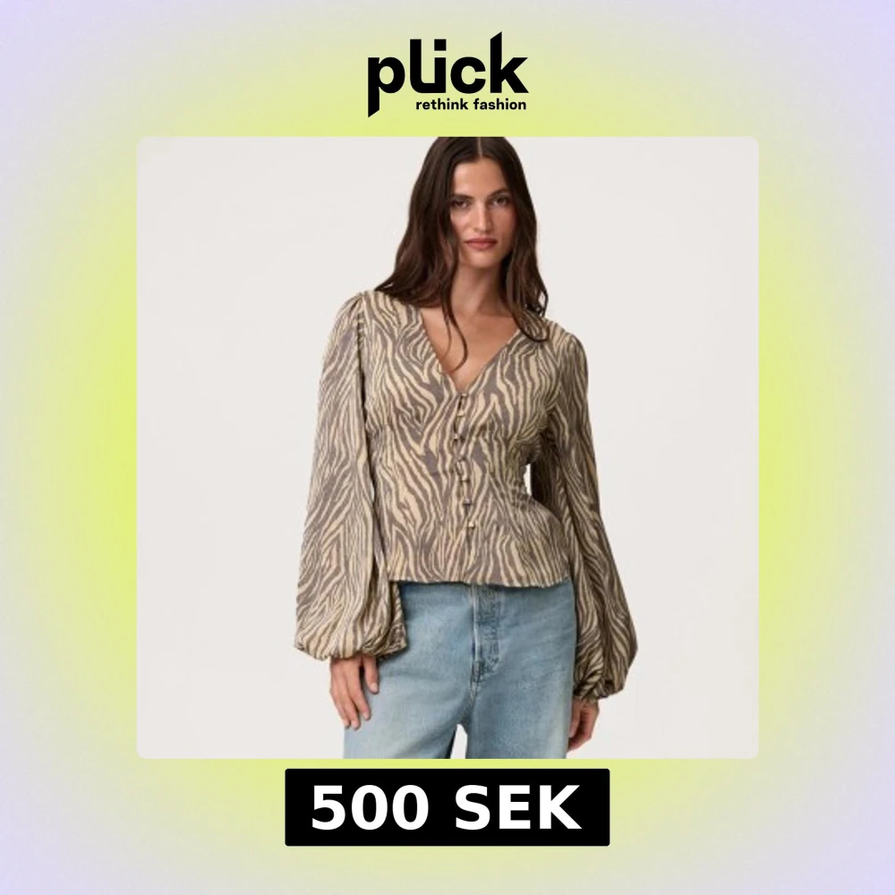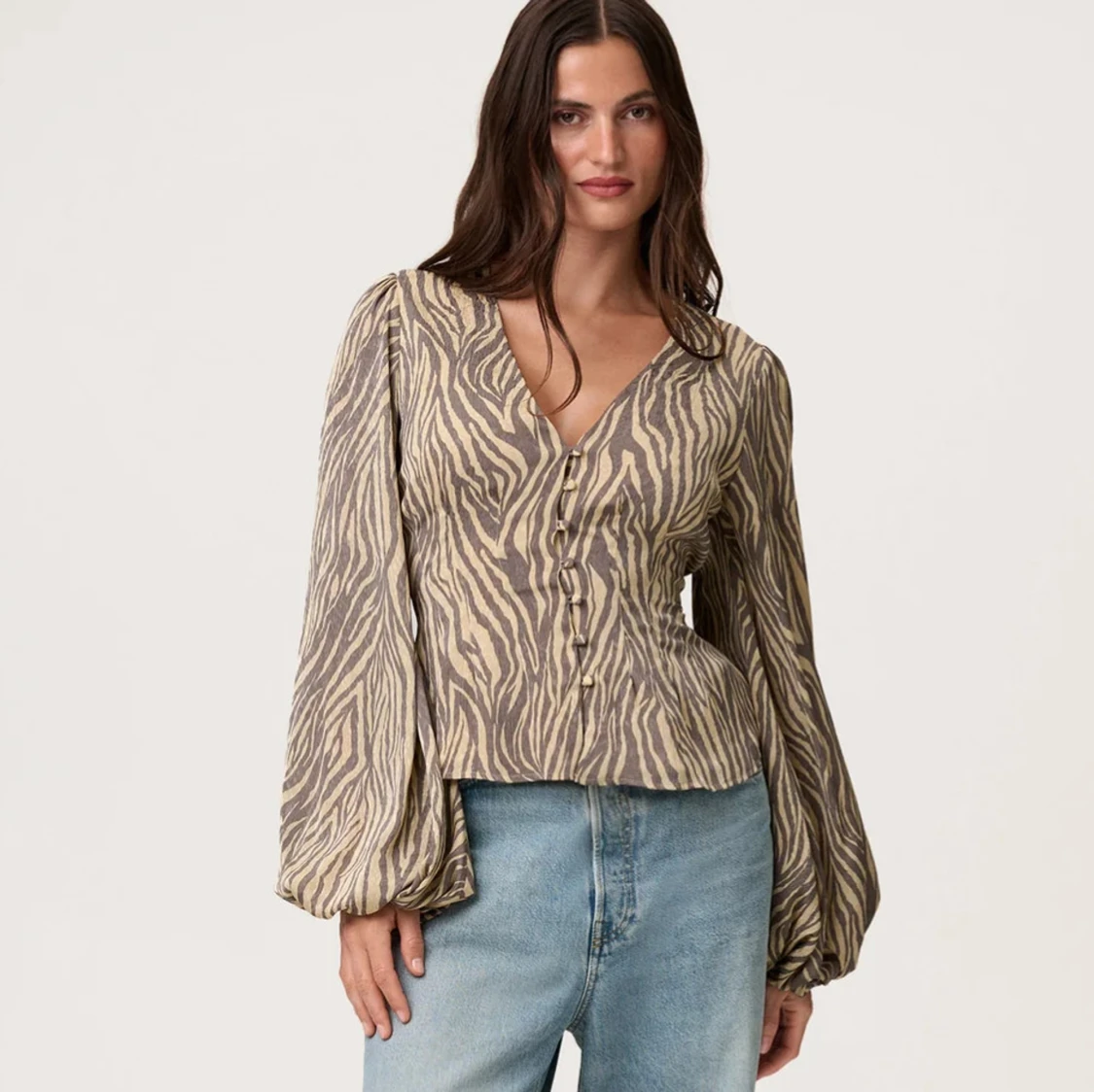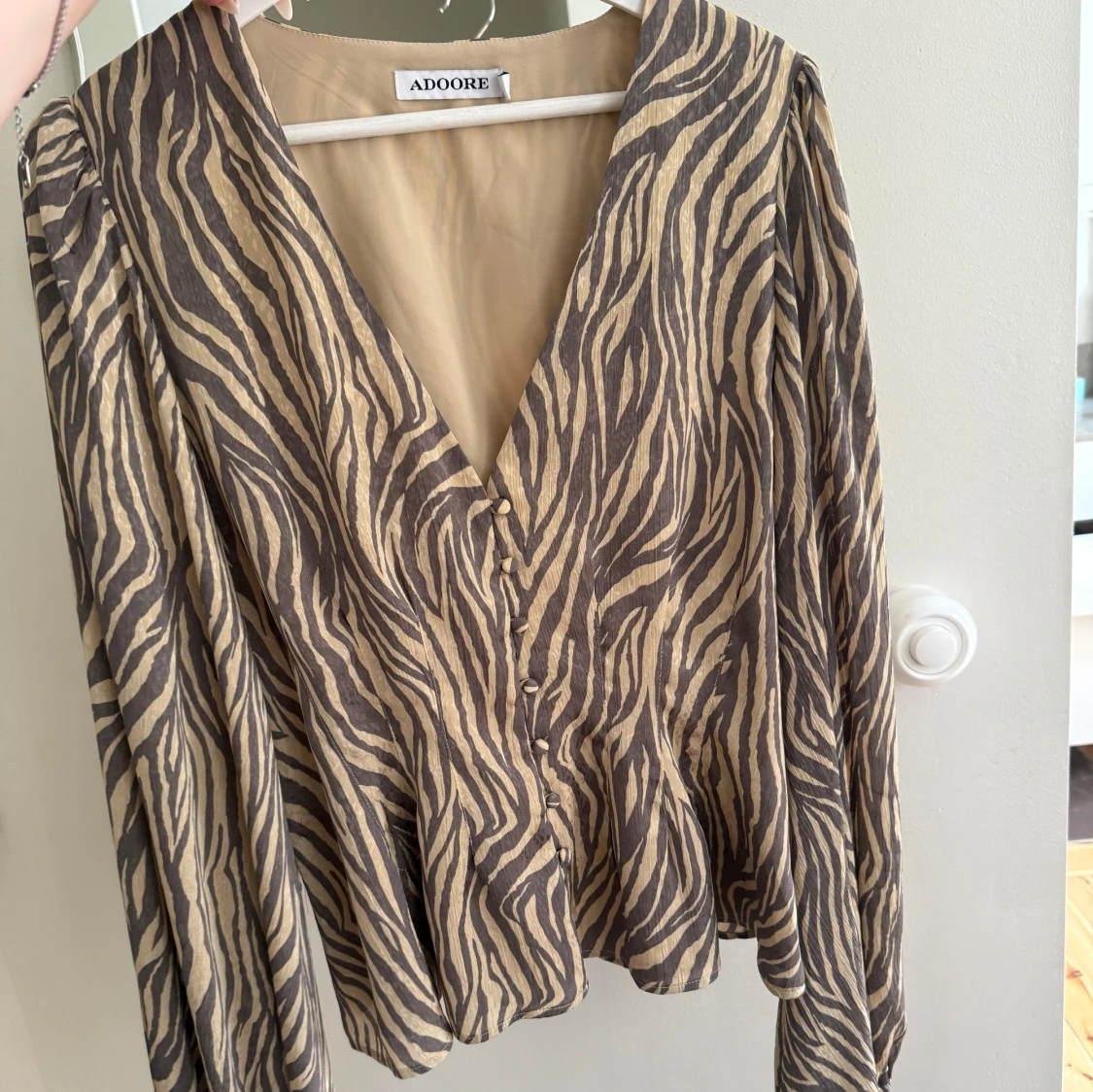 Supersnygg blus från Adoore med zebramönster i beige och brunt. Blusen har v-ringning, knappar framtill och vida, långa ärmar . Endast använd en gång, tyvärr för stor för mig.🥰💕
