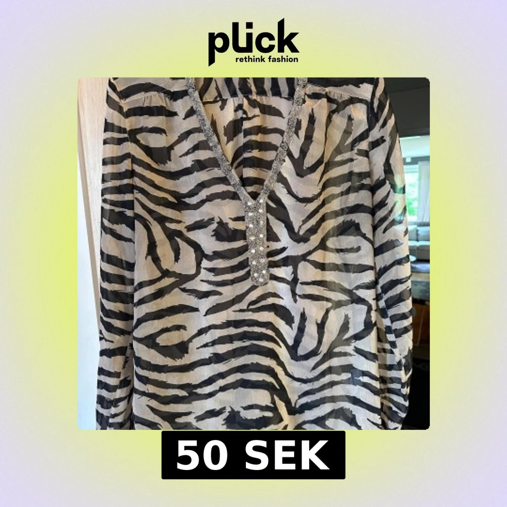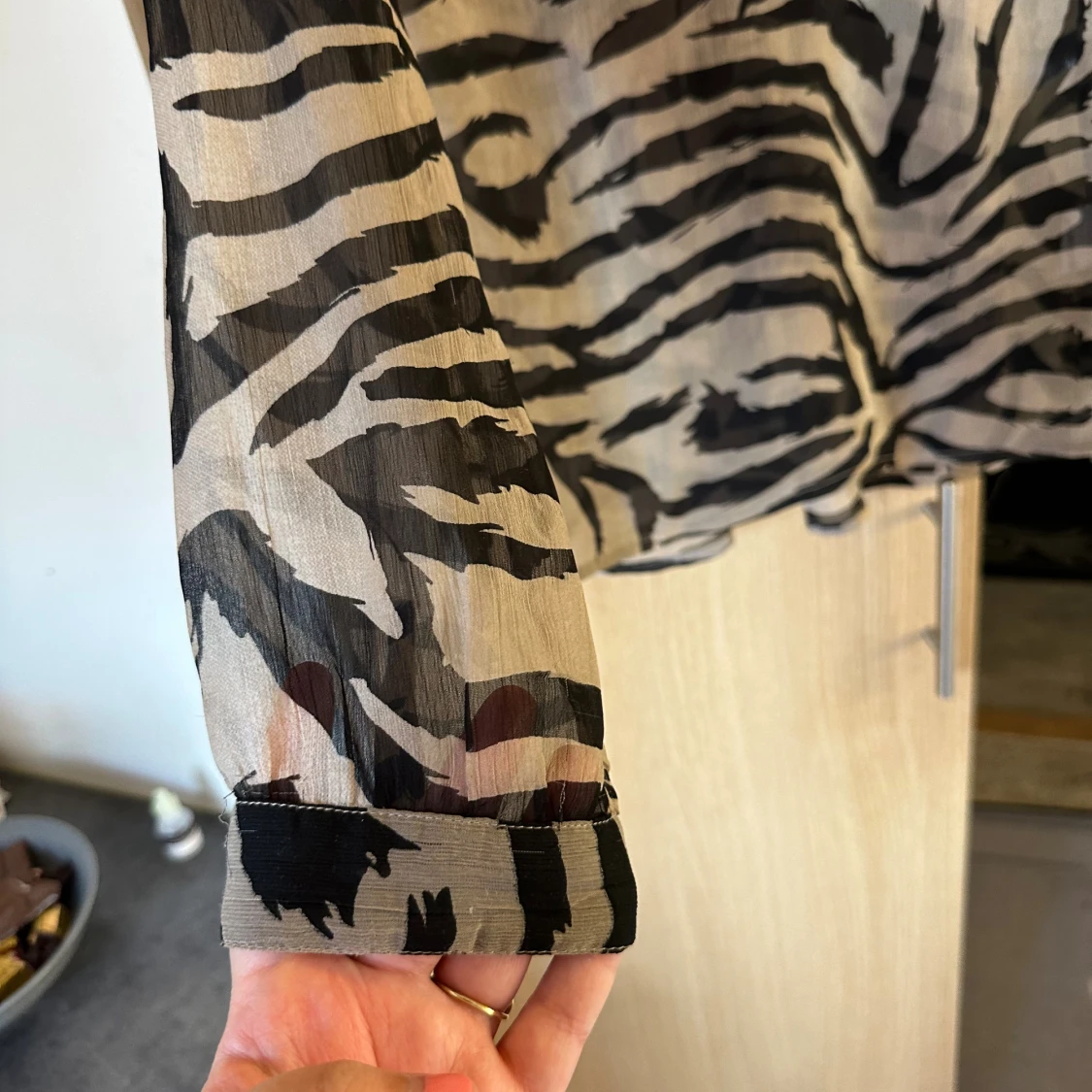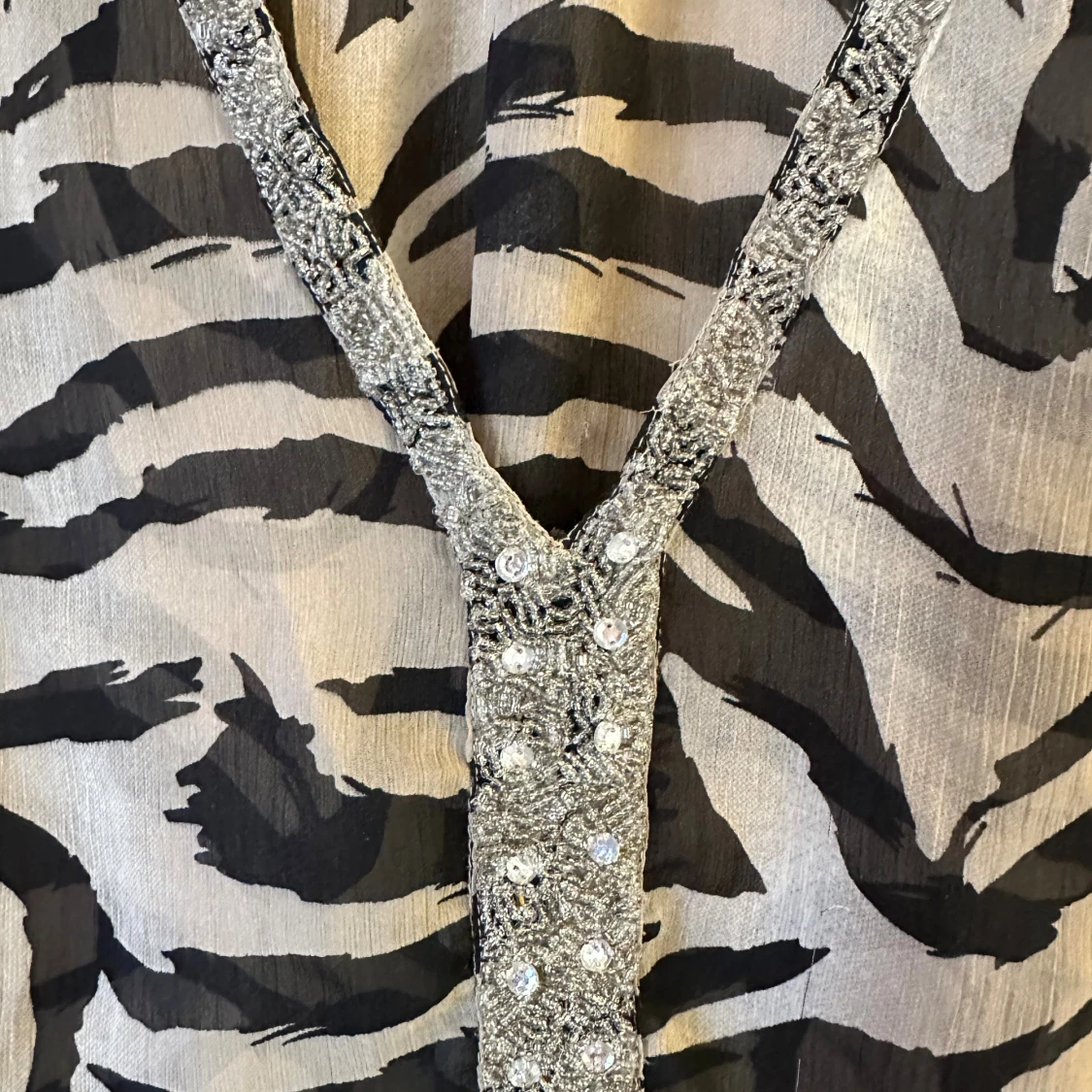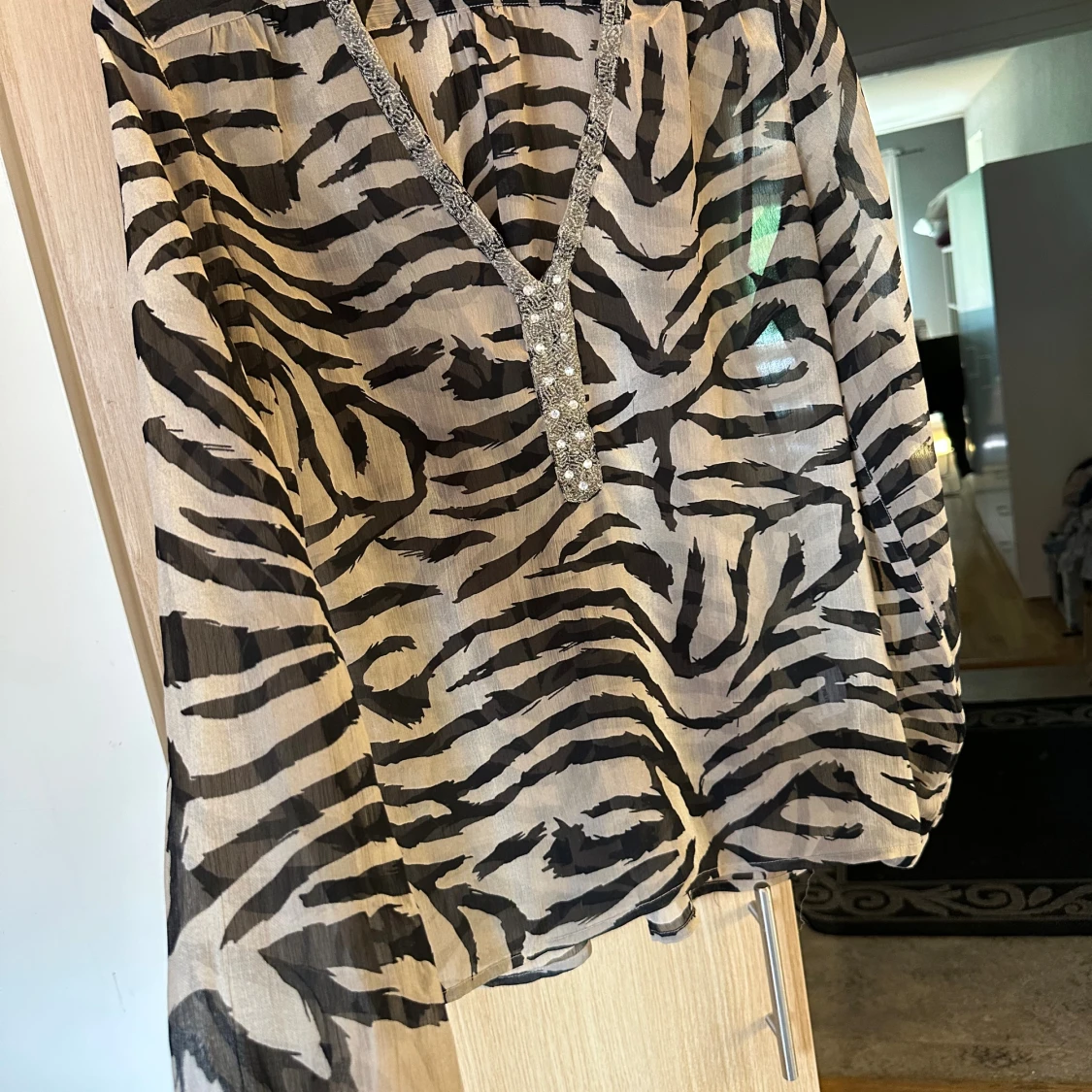 Säljer en transparent zebramönstrad blus i svart och beige med lång ärm. Blusen har en djup v-ringning med glittriga paljettdetaljer och pärlor längs kanten. Materialet är lätt och luftigt, perfekt för att sticka ut med coola detaljer.