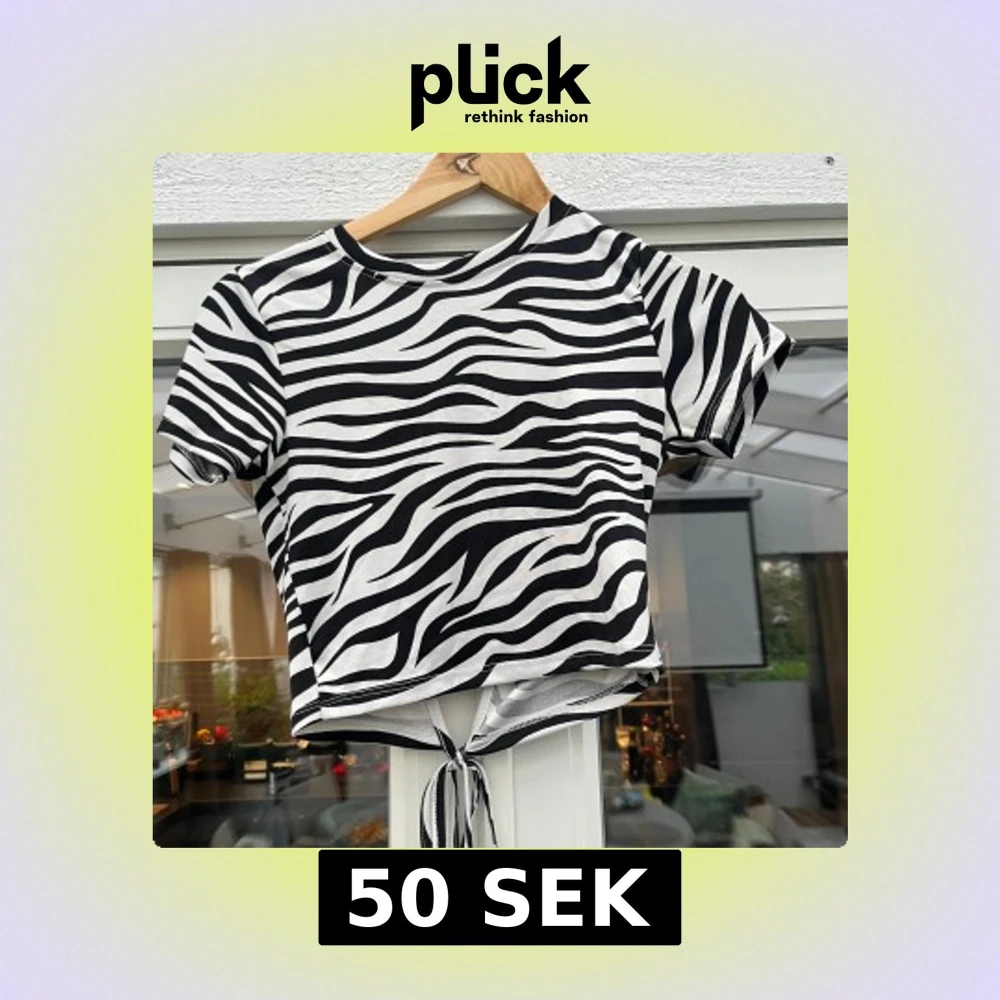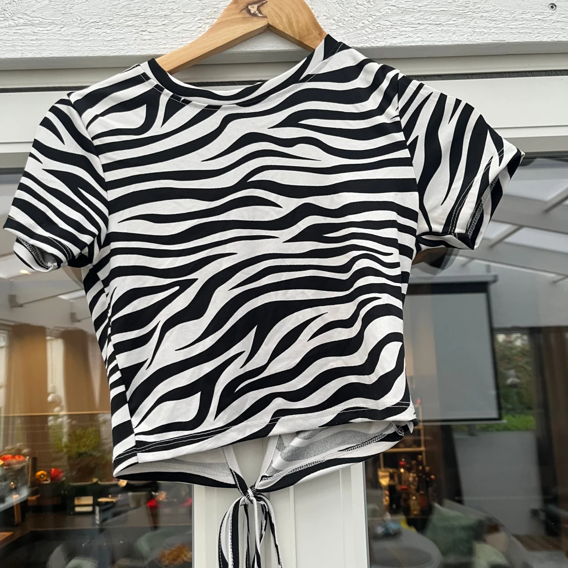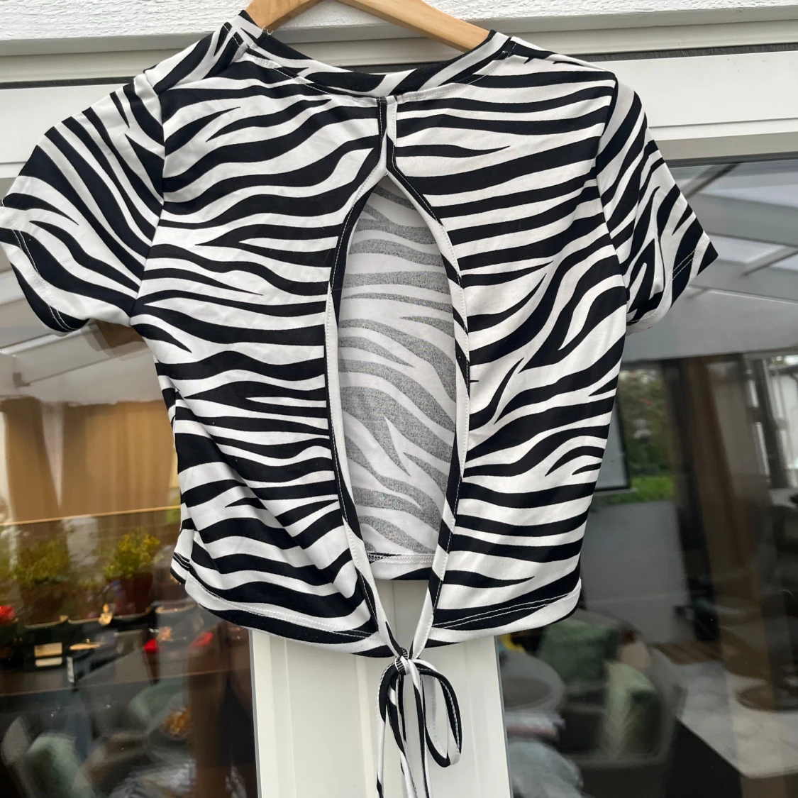Säljer en kort zebramönstrad topp i svart och vitt med knyt i midjan och öppen rygg. Toppen har rund halsringning och korta ärmar. Perfekt för dig som vill sticka ut med ett djurmönster och cool detalj i ryggen.