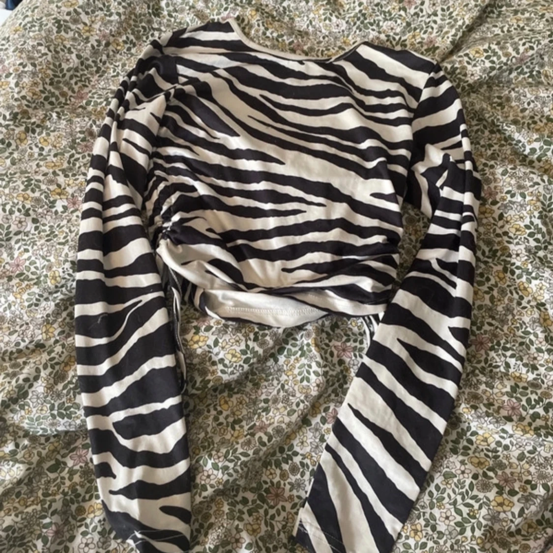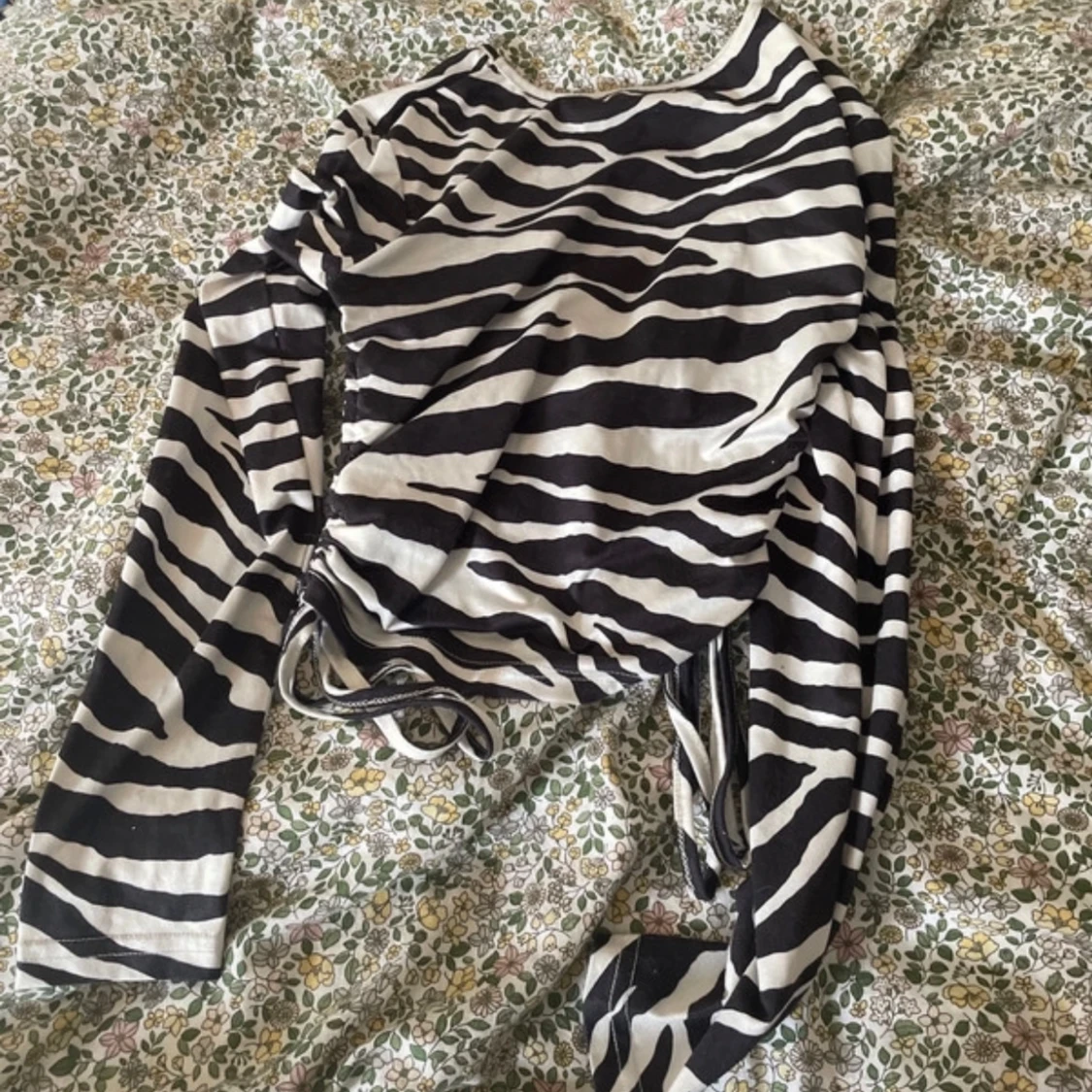 Säljer en supercool zebramönstrad topp med långa ärmar. Den har en snygg snörning på sidan som ger en unik touch. Perfekt för att sticka ut på festen eller bara för en vardag med stil!