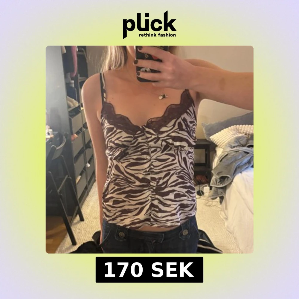 Snygg zebramönstrad linne med smala axelband och spetsdetaljer vid halsringningen.