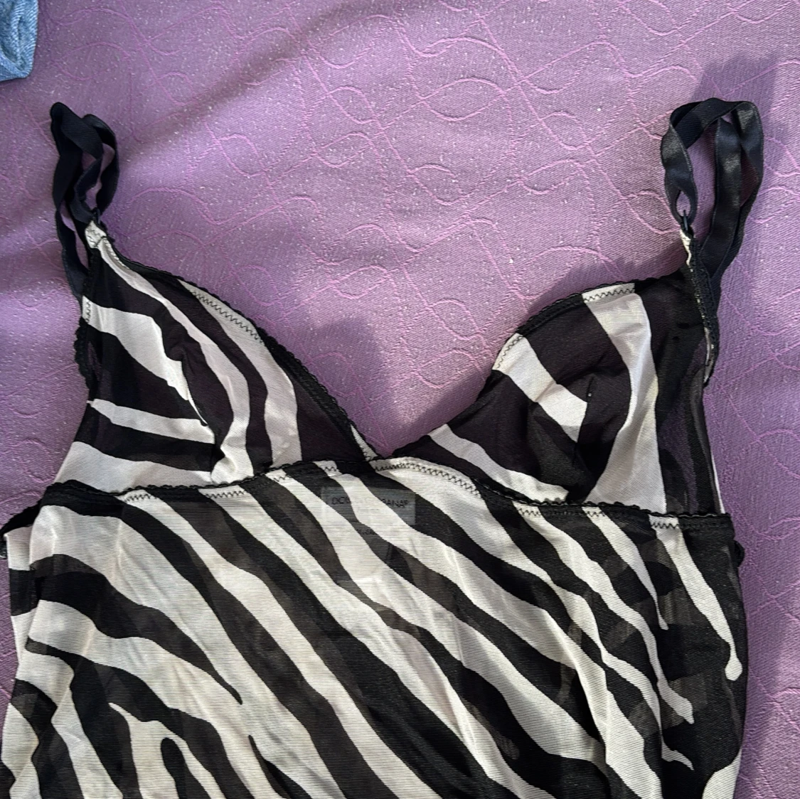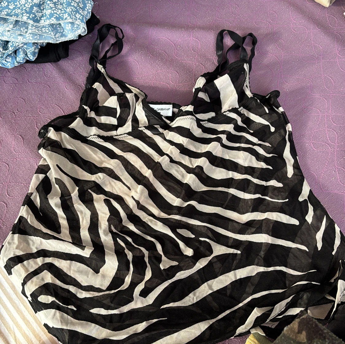Säljer en snygg zebramönstrad linnetopp från Dolce & Gabbana Intimo. Toppen har tunna axelband, svart och vit färg och är gjord i ett lätt, transparent material. 300kr