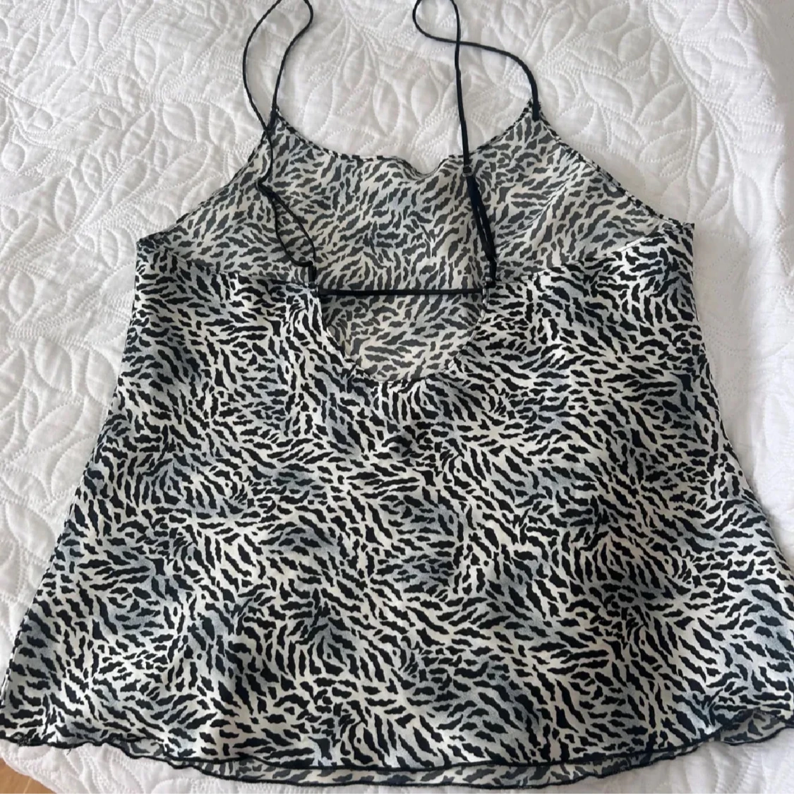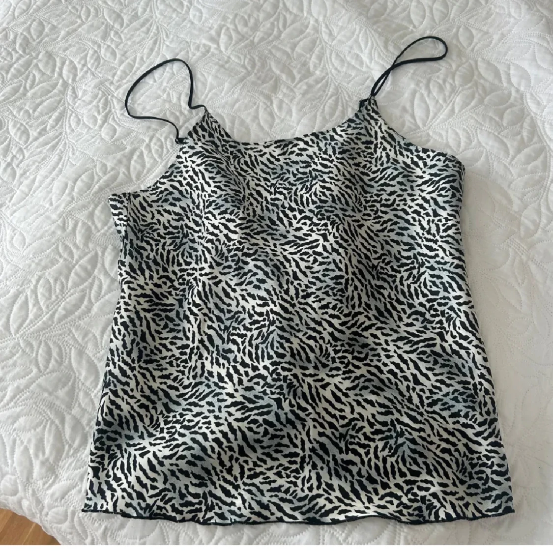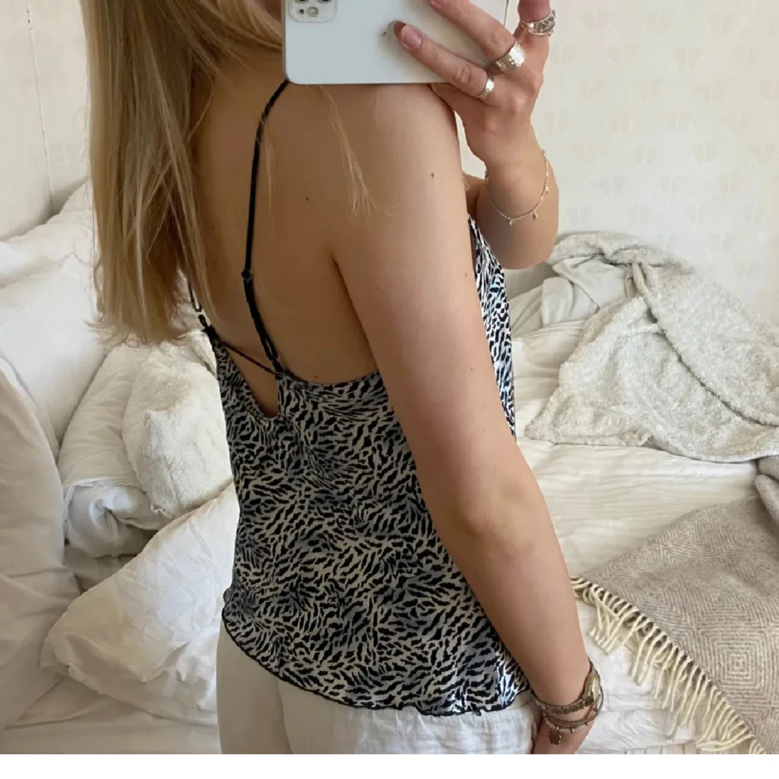 Snygg linnetopp med zebramönster i svart och vitt. Toppen har tunna, justerbara axelband och en lätt utsvängd passform. Perfekt för varma dagar och ger en cool vibe till din outfit. Materialet känns lätt och luftigt mot huden.