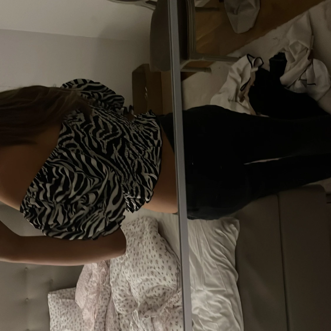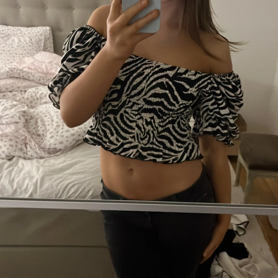 Säljer en trendig zebramönstrad offshoulder topp med korta ärmar. Toppen är croppad och har en snygg passform som framhäver midjan. Perfekt för en utekväll eller en dag på stan. toppen har inga effekter och är helt i nyskick. Den passar alla från XS till medium eftersom att den är väldigt stretchsigg