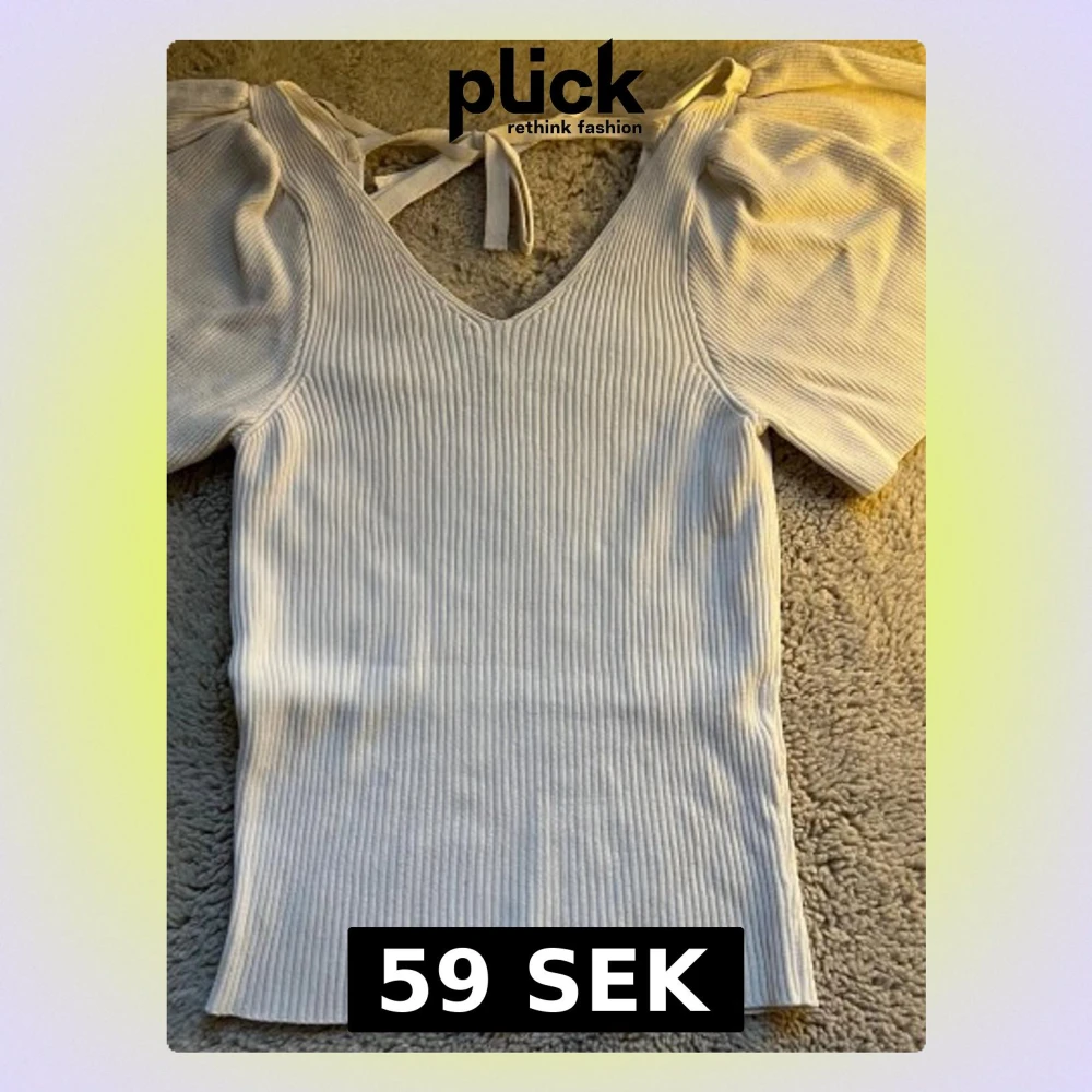 Säljer en vit ribbad topp från ONLY i storlek S. Toppen har korta puffärmar, v-ringning och snygg knytning i nacken. Materialet är mjukt och stretchigt, perfekt för dig som gillar en feminin och trendig stil.