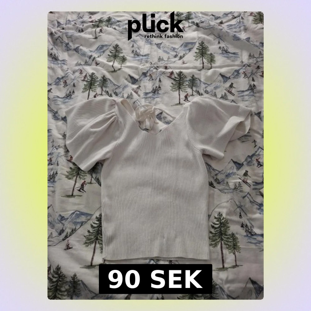 Supersöt vit blus från ONLY i ribbad bomull med puffiga korta ärmar och v-ringning. Toppen har en snygg knytning i ryggen som ger extra detalj. Perfekt för dig som gillar en feminin och trendig look med lite volym på axlarna.