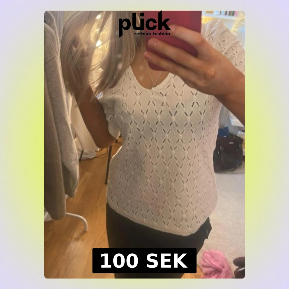 Söt vit blus med v-ringning och halvlånga ärmar. Blusen har ett spetsliknande hålmönster och är lätt figursydd för en feminin look. Perfekt till jeans eller kjol för en fräsch stil.