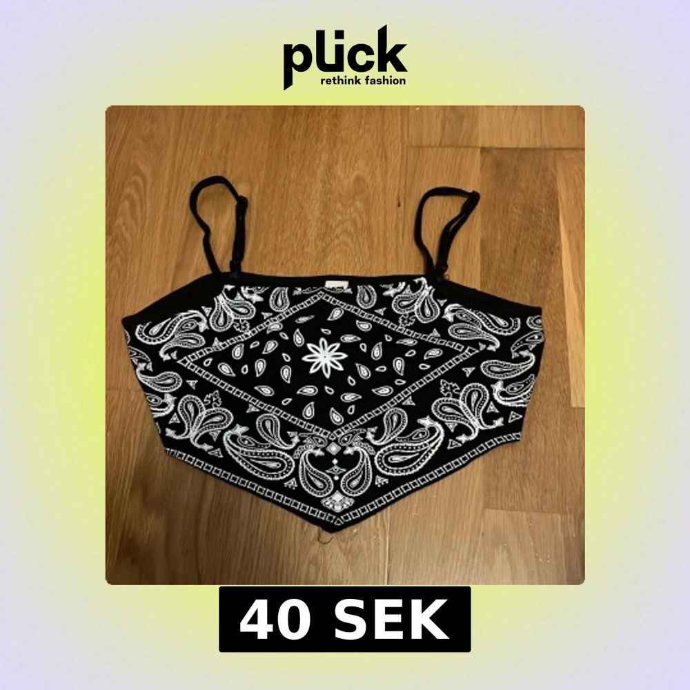 Säljer en snygg svart topp från Shein med bandana-mönster i vitt. Toppen har smala axelband och en cool design som ger en unik look. Perfekt för en dag på stranden i sommar!🖤