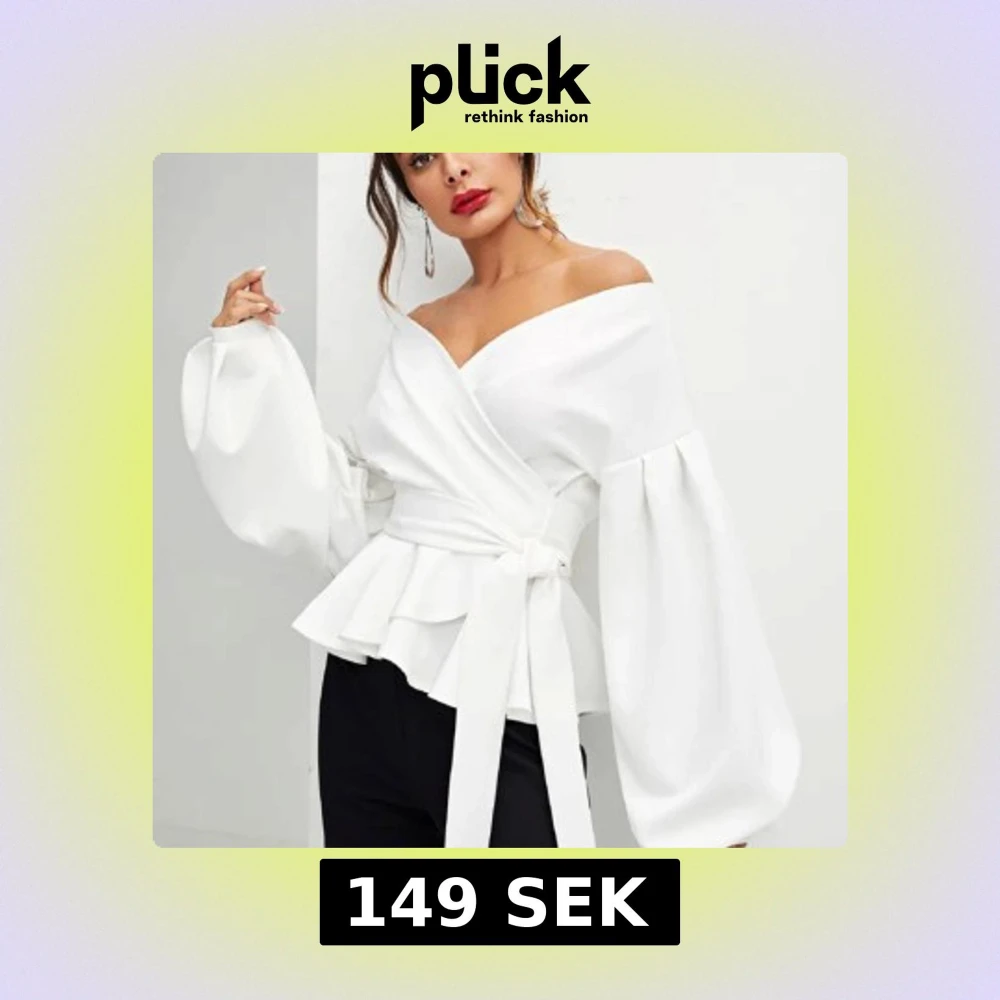Elegant vit omlottblus med offshoulder-design och långa ärmar. Blusen har volangdetaljer och ett knytband i midjan för en smickrande passform. Perfekt för en stilren look. Finns också i svart.