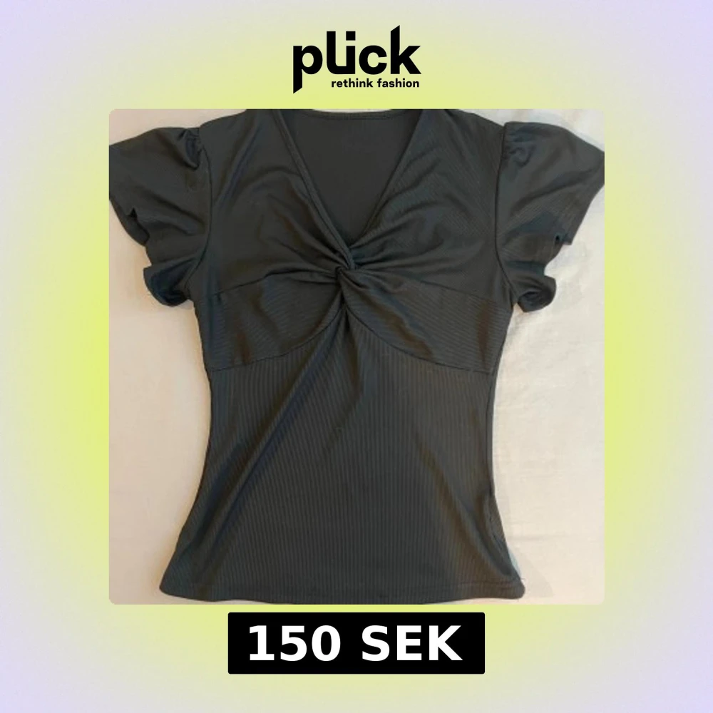 Snygg svart ribbad topp med korta ärmar och twistad detalj framtill. Djup v-ringning ger en trendig look och materialet är stretchigt och följsamt.