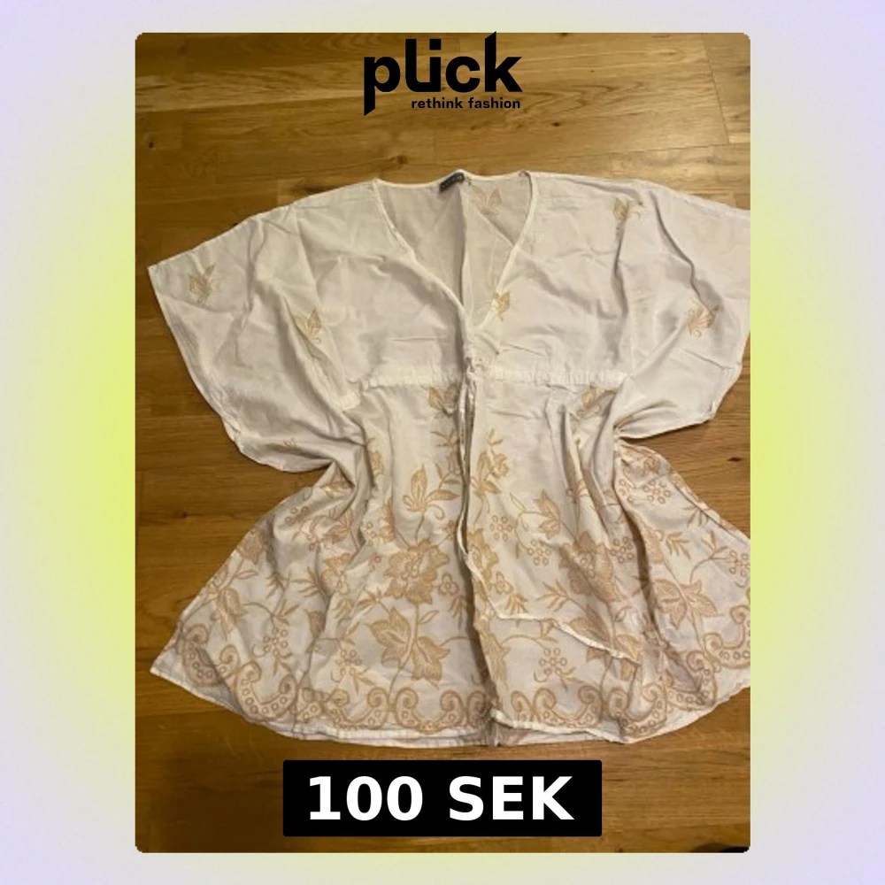 Säljer en luftig vit blus med v-ringning och korta, vida ärmar. Blusen har ljusbeige broderade blommor och fjärilar samt en knytning i midjan. Perfekt för varma dagar och har en bohemisk vibe.