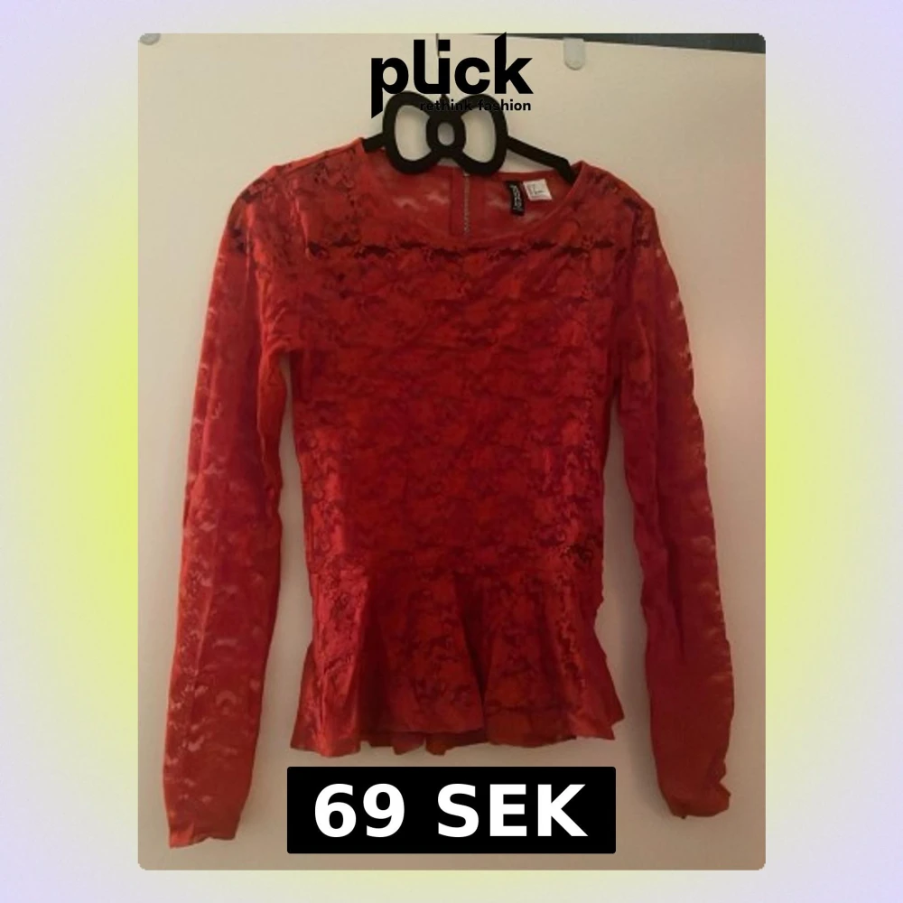 Säljer en röd långärmad blus i spets med volang nertill. Blusen har rund halsringning och dragkedja i ryggen. Tunn och genomskinlig spets ger en snygg look, perfekt att styla med jeans eller kjol. Det är storlekek 38 men skulle säga att den är söm 34/36