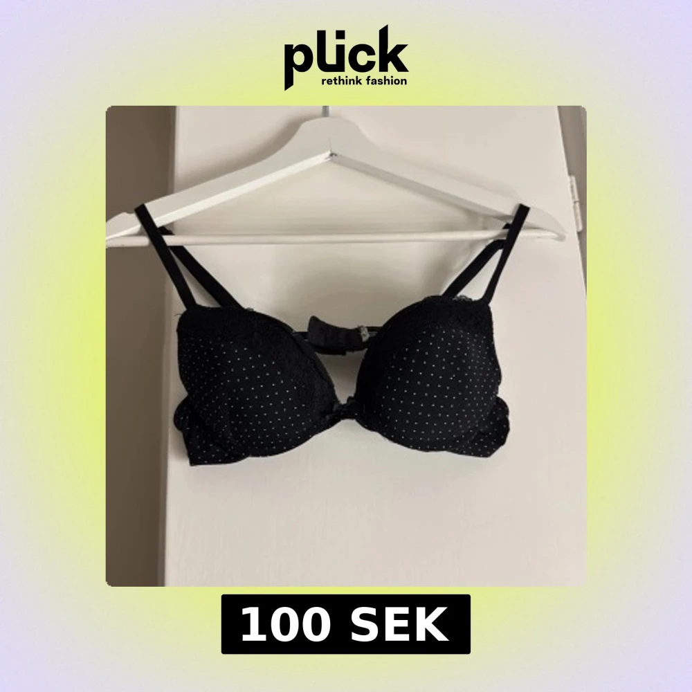 Mörkblå bh med tunna axelband och vadderade kupor. Prickigt mönster över hela och dekorativ spets upptill. ⭐️⭐️