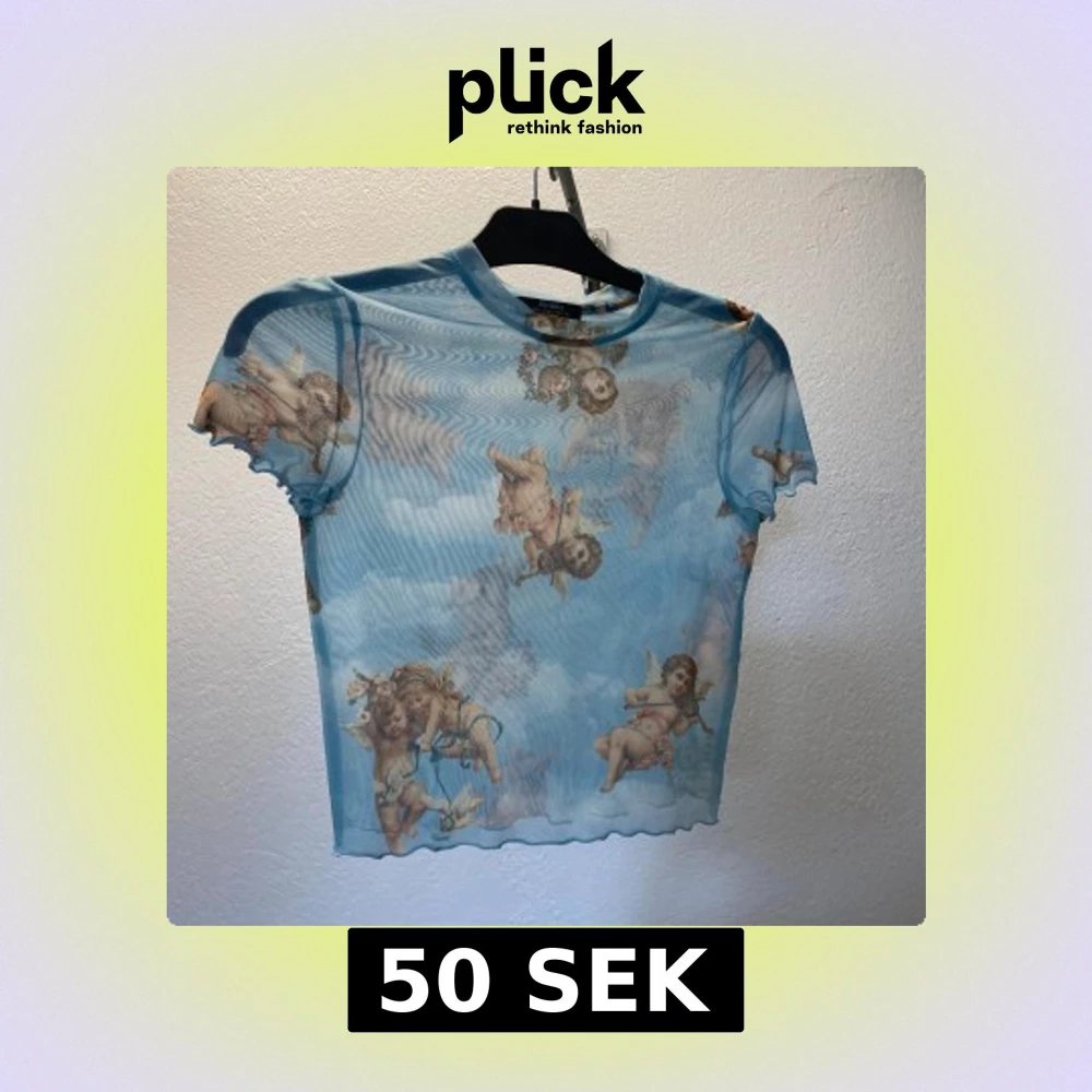 Säljer en transparent blå mesh topp från Bershka med korta ärmar och tryck av änglar och moln. Toppen har vågiga kanter vid ärmslut och nederkant, och är perfekt för att skapa en unik och trendig look.