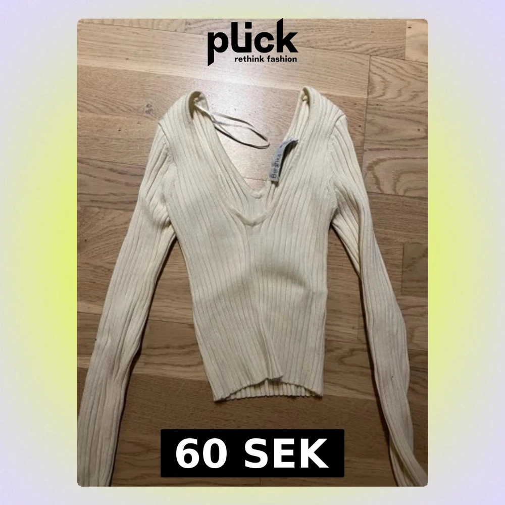 Säljer en ljusbeige ribbad topp från Bershka med lång ärm och djup v-ringning. Toppen är croppad och har en slim passform som sitter snyggt på kroppen. Perfekt att styla med höga jeans eller kjol.