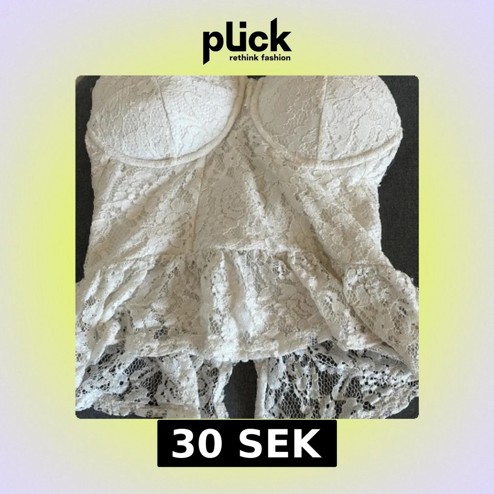 Supersöt vit korsett från Bik Bok i storlek M, täckt med romantisk spets och volangdetaljer nedtill. Axelbandslös bandeau-modell med formade kupor och dragkedja i ryggen. Perfekt för dig som vill ha en feminin och trendig look.