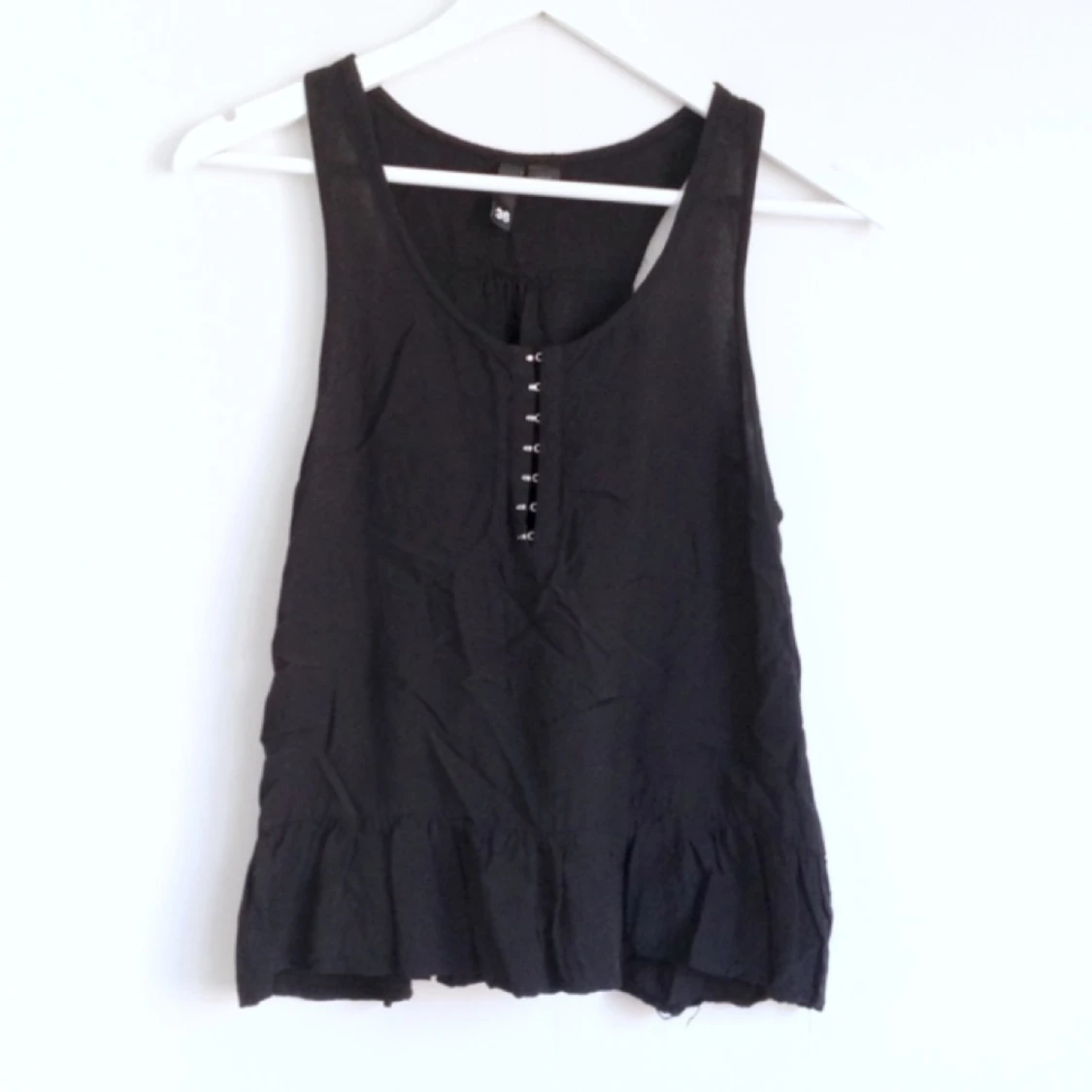 Svart linne med snygg knäppning och volangkant längst ned. Fint skick - men mycket ostruken på bilden!