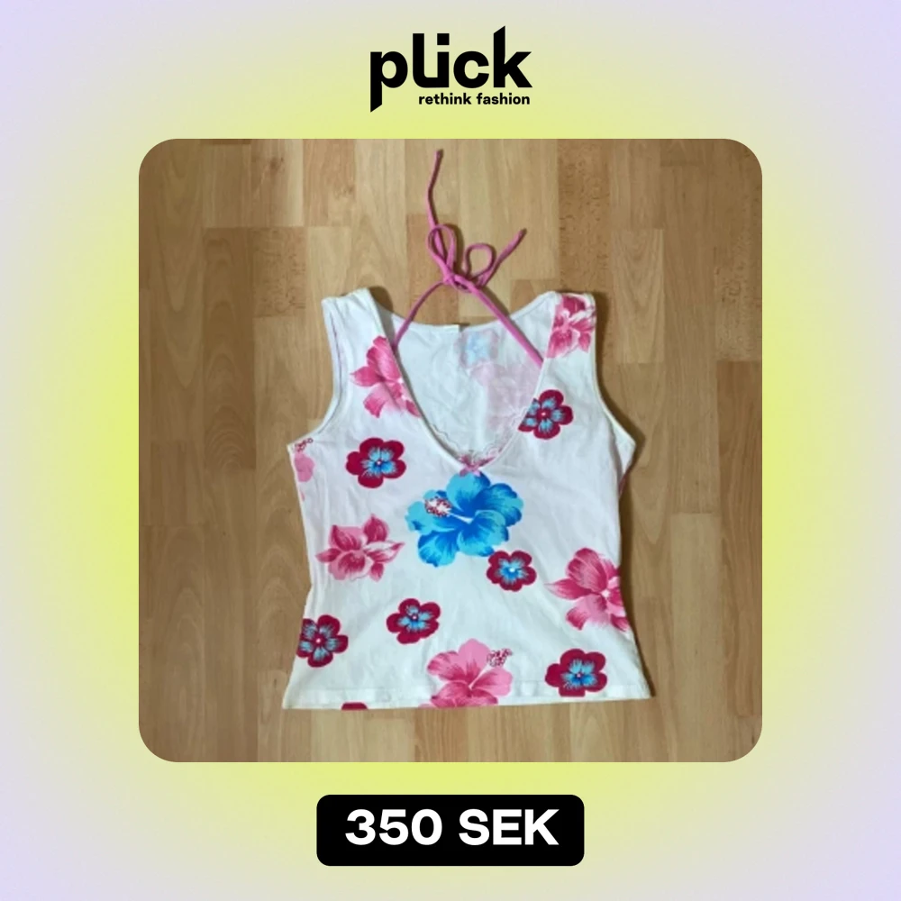 Topp med blommigt mönster, har en insydd rosa croppad linne under đ