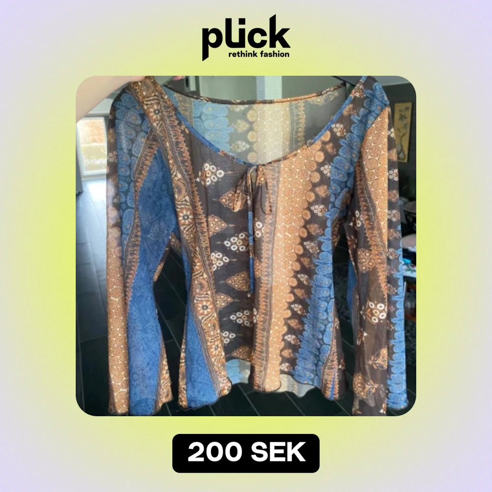 Köpt second hand för många år sen. Står ingen storlek i men skulle säga det är en S. Litet hål i nacken (bild 3) men inget som syns när man har den på sig. Genomskinligt material men är mindre genomskinlig än vad den ser ut!