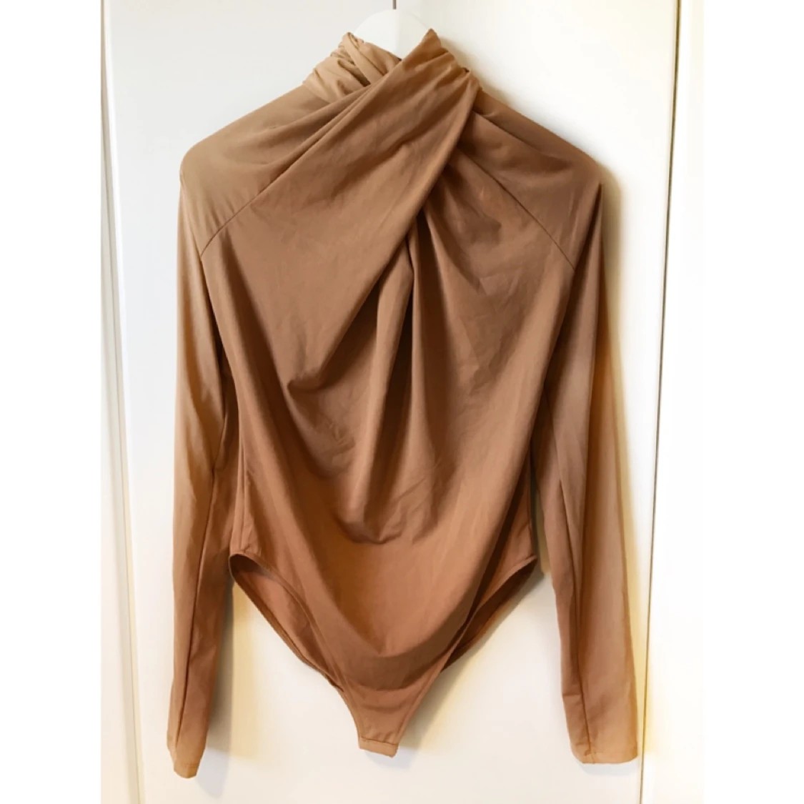 Kamelfärgad body från H&M. Hög i halsen med drapering fram och dragkedja bak. Aldrig använd och prislappen sitter kvar. Pris exklusive frakt.