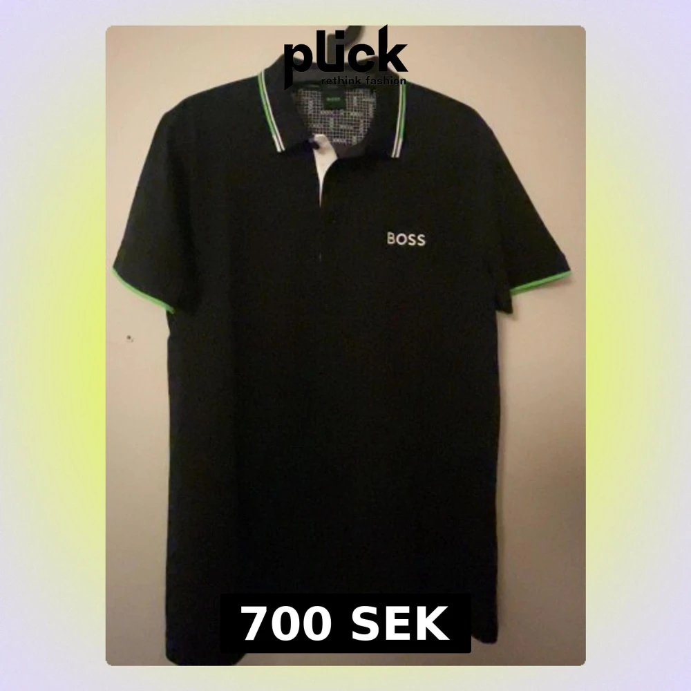 Snygg svart pikétröja från BOSS med vit logga på bröstet och ryggen. Kragen har gröna och vita detaljer och ärmarna har matchande gröna kanter. Klassisk passform och korta ärmar, perfekt till en clean och sportig look.