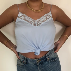 Ljusblått silkeslinne i nyskick med spetsdetaljer 🦋 Storlek S men funkar även som M. Köpare står för frakt!