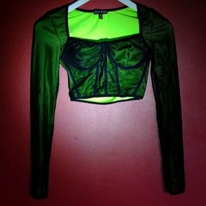 En grön cool långärmad korsett-topp från märket Current Mood! Har svart meshtyg över det gröna och den översta bygeln är hård. Är i storlek XS men hade nog kunnat vara S också då den har lite stretch 😁🌸