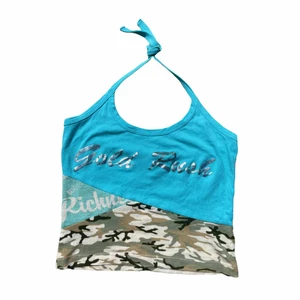 !-20%!Dösnygg turkos halternecktopp från 00-talet från märket Only med kamoflage mönstrat nät tyg och silvrigt tryck på fram o baksida! Väldigt unik! I fint skick! Storlek S!💋